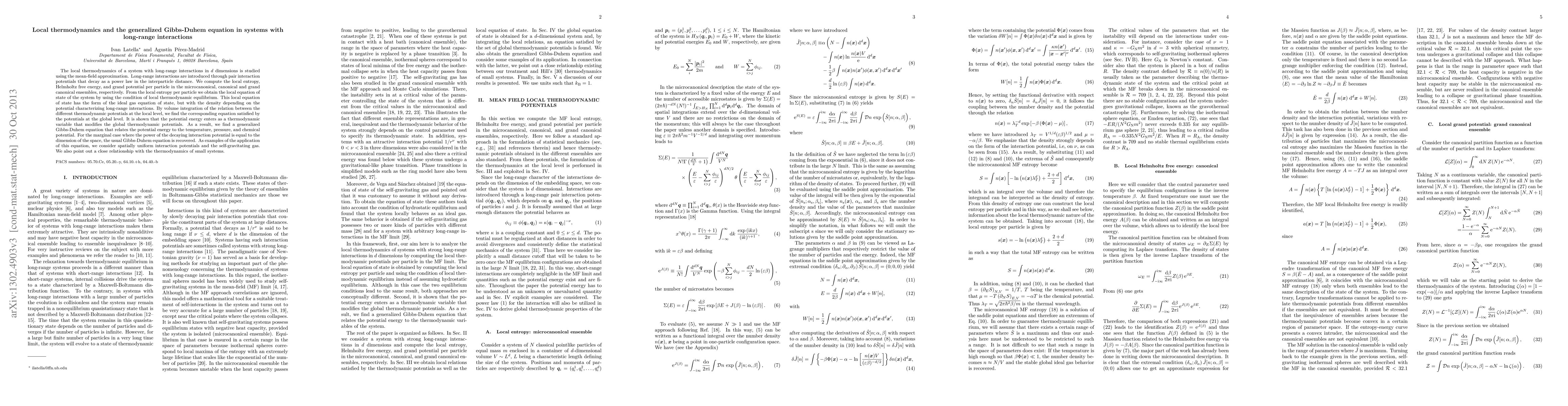 The local thermodynamics of a system with long-range interactions in d dimensions is studied using the mean-field approximation. Long-range interactions are introduced through pair interaction potentials that decay as a power law in the interparticle distance. We compute the local entropy, Helmholtz free energy, and grand potential per particle in the microcanonical, canonical, and grand canonical ensembles, respectively. From the local entropy per particle we obtain the local equation of state of the system by using the condition of local thermodynamic equilibrium. This local equation of state has the form of the ideal gas equation of state, but with the density depending on the potential characterizing long-range interactions. By volume integration of the relation between the different thermodynamic potentials at the local level, we find the corresponding equation satisfied by the potentials at the global level. It is shown that the potential energy enters as a thermodynamic variable that modifies the global thermodynamic potentials. As a result, we find a generalized Gibbs-Duhem equation that relates the potential energy to the temperature, pressure, and chemical potential. For the marginal case where the power of the decaying interaction potential is equal to the dimension of the space, the usual Gibbs-Duhem equation is recovered. As examples of the application of this equation, we consider spatially uniform interaction potentials and the self-gravitating gas. We also point out a close relationship with the thermodynamics of small systems.