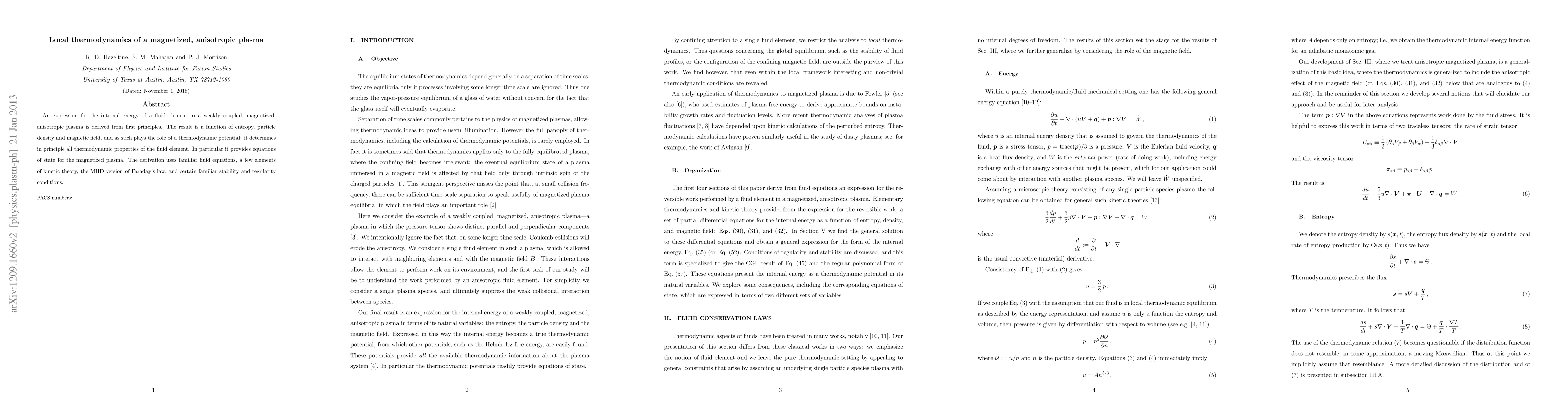 An expression for the internal energy of a fluid element in a weakly coupled, magnetized, anisotropic plasma is derived from first principles. The result is a function of entropy, particle density and magnetic field, and as such plays the role of a thermodynamic potential: it determines in principle all thermodynamic properties of the fluid element. In particular it provides equations of state for the magnetized plasma. The derivation uses familiar fluid equations, a few elements of kinetic theory, the MHD version of Faraday's law, and certain familiar stability and regularity conditions.