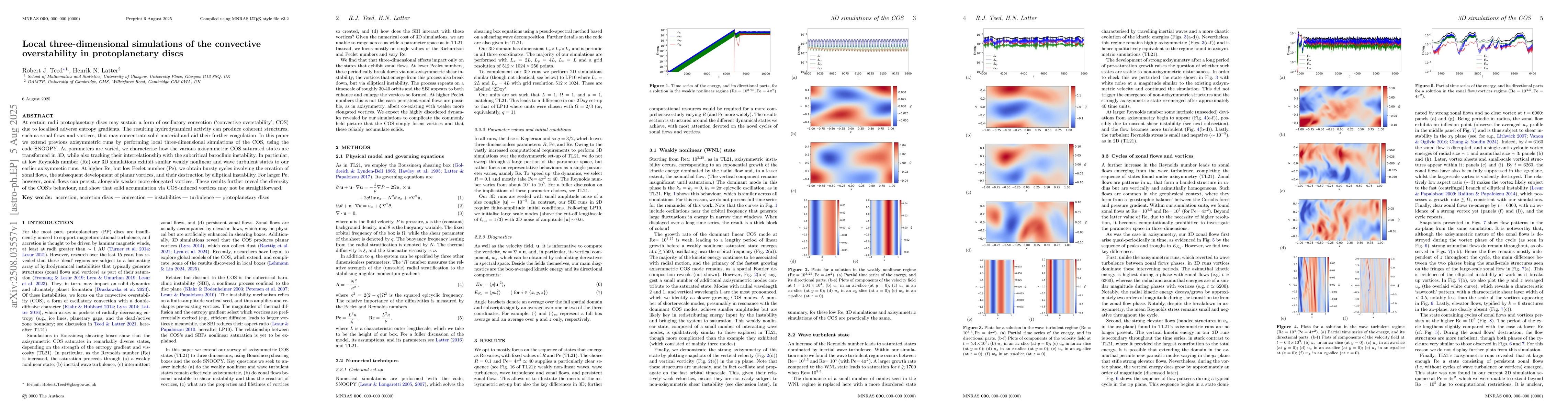 At certain radii protoplanetary discs may sustain a form of oscillatory convection (`convective overstability'; COS) due to localised adverse entropy gradients. The resulting hydrodynamical activity can produce coherent structures, such as zonal flows and vortices, that may concentrate solid material and aid their further coagulation. In this paper we extend previous axisymmetric runs by performing local three-dimensional simulations of the COS, using the code SNOOPY. As parameters are varied, we characterise how the various axisymmetric COS saturated states are transformed in 3D, while also tracking their interrelationship with the subcritical baroclinic instability. In particular, at low Reynolds number (Re) our 3D simulations exhibit similar weakly nonlinear and wave turbulent states to our earlier axisymmetic runs. At higher Re, but low Peclet number (Pe), we obtain bursty cycles involving the creation of zonal flows, the subsequent development of planar vortices, and their destruction by elliptical instability. For larger Pe, however, zonal flows can persist, alongside weaker more elongated vortices. These results further reveal the diversity of the COS's behaviour, and show that solid accumulation via COS-induced vortices may not be straightforward.