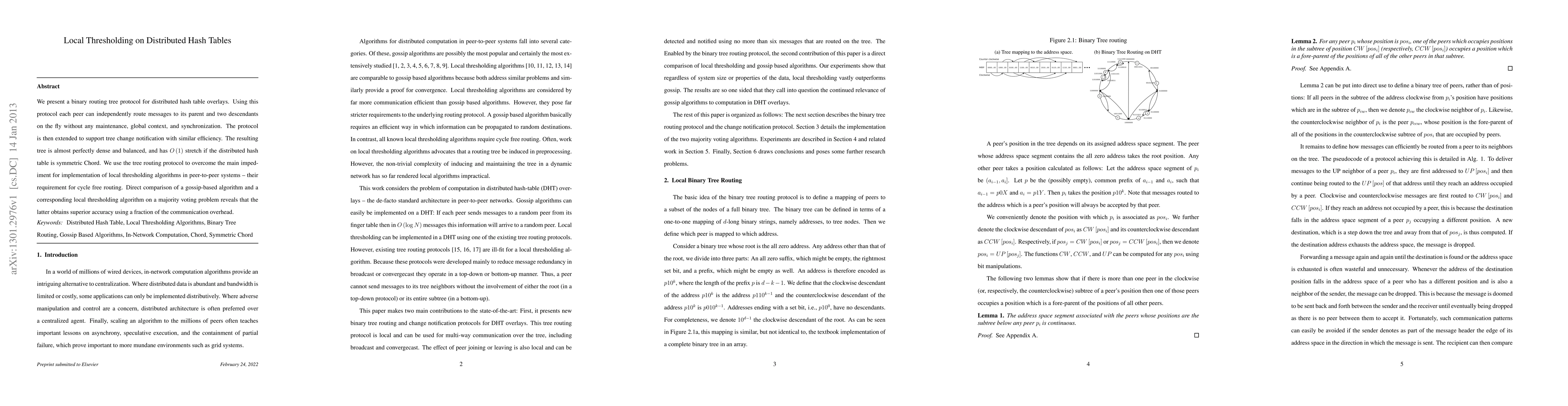 We present a binary routing tree protocol for distributed hash table overlays. Using this protocol each peer can independently route messages to its parent and two descendants on the fly without any maintenance, global context, and synchronization. The protocol is then extended to support tree change notification with similar efficiency. The resulting tree is almost perfectly dense and balanced, and has O(1) stretch if the distributed hash table is symmetric Chord. We use the tree routing protocol to overcome the main impediment for implementation of local thresholding algorithms in peer-to-peer systems -- their requirement for cycle free routing. Direct comparison of a gossip-based algorithm and a corresponding local thresholding algorithm on a majority voting problem reveals that the latter obtains superior accuracy using a fraction of the communication overhead.