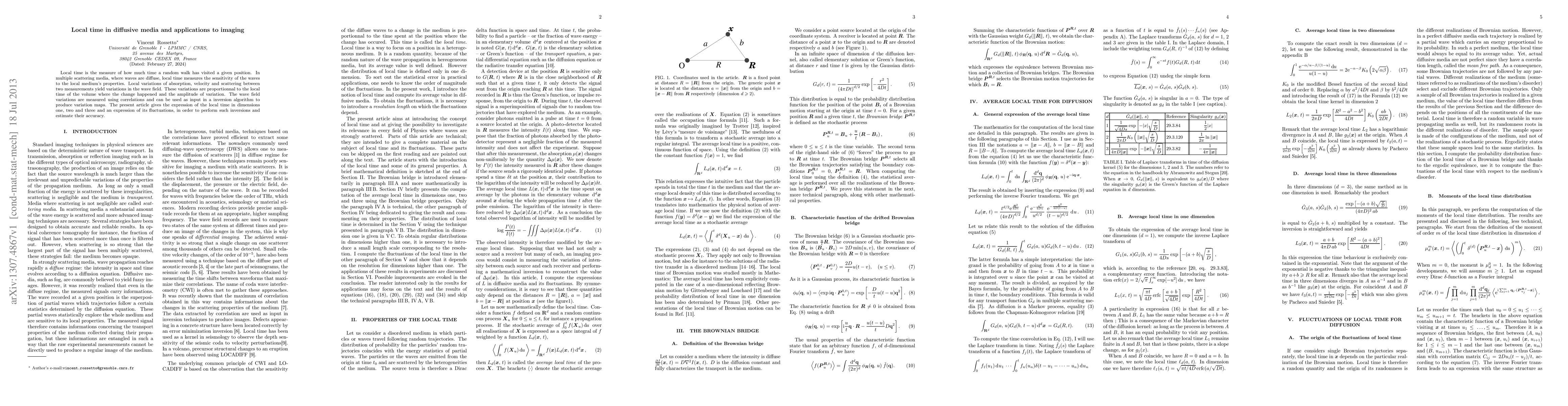 Local time is the measure of how much time a random walk has visited a given position. In multiple scattering media, where waves are diffuse, local time measures the sensitivity of the waves to the local medium's properties. Local variations of absorption, velocity and scattering between two measurements yield variations in the wave field. These variations are proportionnal to the local time of the volume where the change happened and the amplitude of variation. The wave field variations are measured using correlations and can be used as input in a inversion algorithm to produce variation maps. The present article gives the expression of the local time in dimensions one, two and three and an expression of its fluctuations, in order to perform such inversions and estimate their accuracy.