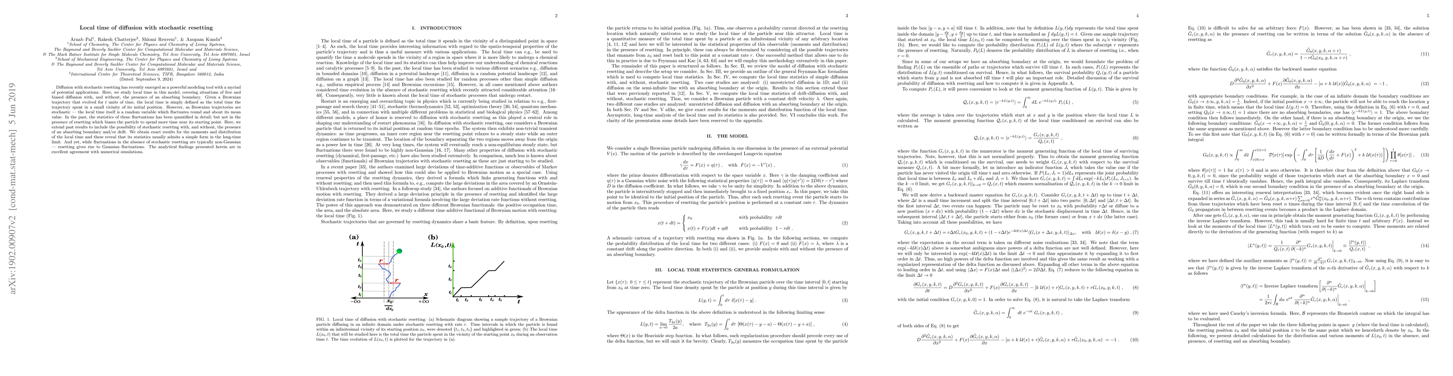 Diffusion with stochastic resetting has recently emerged as a powerful modeling tool with a myriad of potential applications. Here, we study local time in this model, covering situations of free and biased diffusion with, and without, the presence of an absorbing boundary. Given a Brownian trajectory that evolved for $t$ units of time, the local time is simply defined as the total time the trajectory spent in a small vicinity of its initial position. However, as Brownian trajectories are stochastic --- the local time itself is a random variable which fluctuates round and about its mean value. In the past, the statistics of these fluctuations has been quantified in detail; but not in the presence of resetting which biases the particle to spend more time near its starting point. Here, we extend past results to include the possibility of stochastic resetting with, and without, the presence of an absorbing boundary and/or drift. We obtain exact results for the moments and distribution of the local time and these reveal that its statistics usually admits a simple form in the long-time limit. And yet, while fluctuations in the absence of stochastic resetting are typically non-Gaussian --- resetting gives rise to Gaussian fluctuations. The analytical findings presented herein are in excellent agreement with numerical simulations.