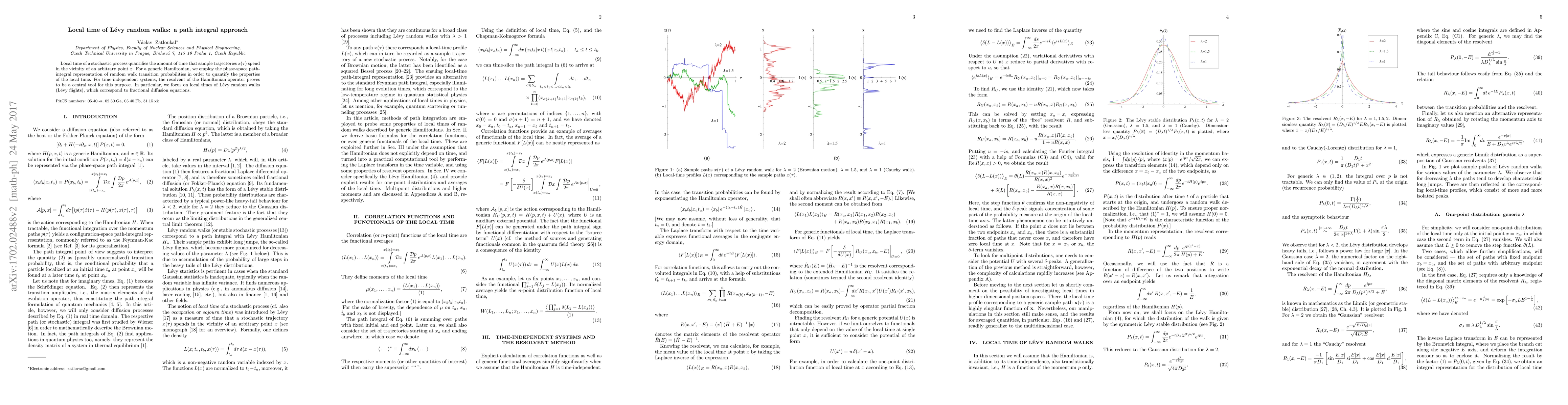 Local time of a stochastic process quantifies the amount of time that sample trajectories $x(\tau)$ spend in the vicinity of an arbitrary point $x$. For a generic Hamiltonian, we employ the phase-space path-integral representation of random walk transition probabilities in order to quantify the properties of the local time. For time-independent systems, the resolvent of the Hamiltonian operator proves to be a central tool for this purpose. In particular, we focus on local times of Levy random walks (or Levy flights), which correspond to fractional diffusion equations.