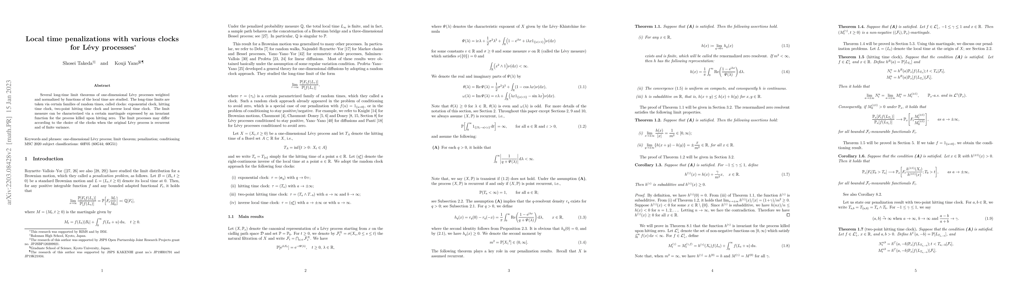 This paper investigates long-time limit theorems for one-dimensional Lévy processes, focusing on their behavior weighted by local time functions. Various clocks, including exponential, hitting time, and inverse local time clocks, are used to characterize the limit measures, revealing differences in limit processes based on the choice of clock for recurrent Lévy processes with finite variance.