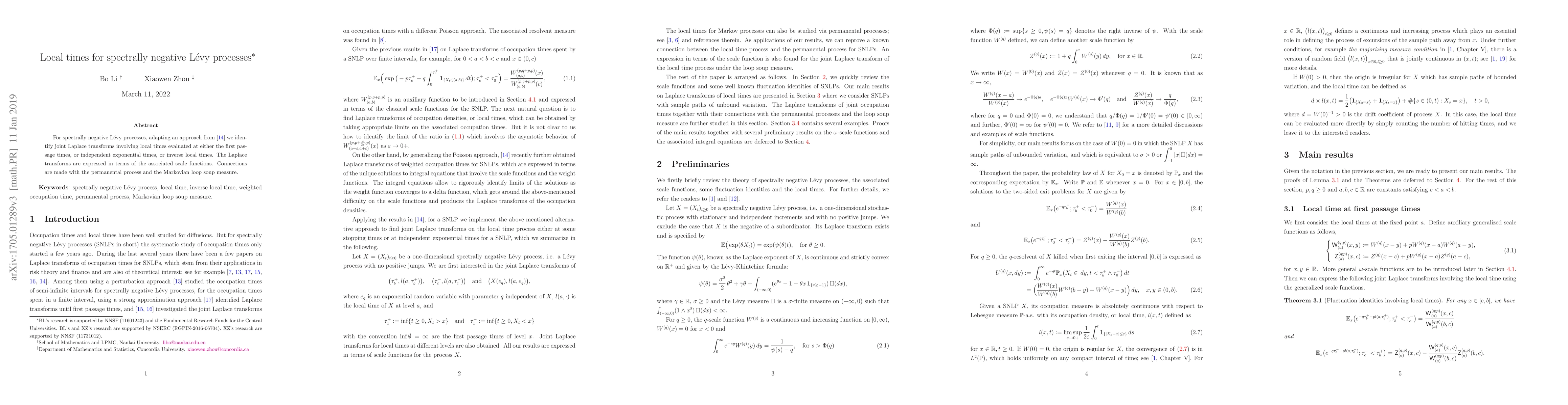 This paper identifies joint Laplace transforms for spectrally negative Lévy processes using local times, expressed in terms of associated scale functions, and links these transforms to the permanental process and Markovian loop soup measure.