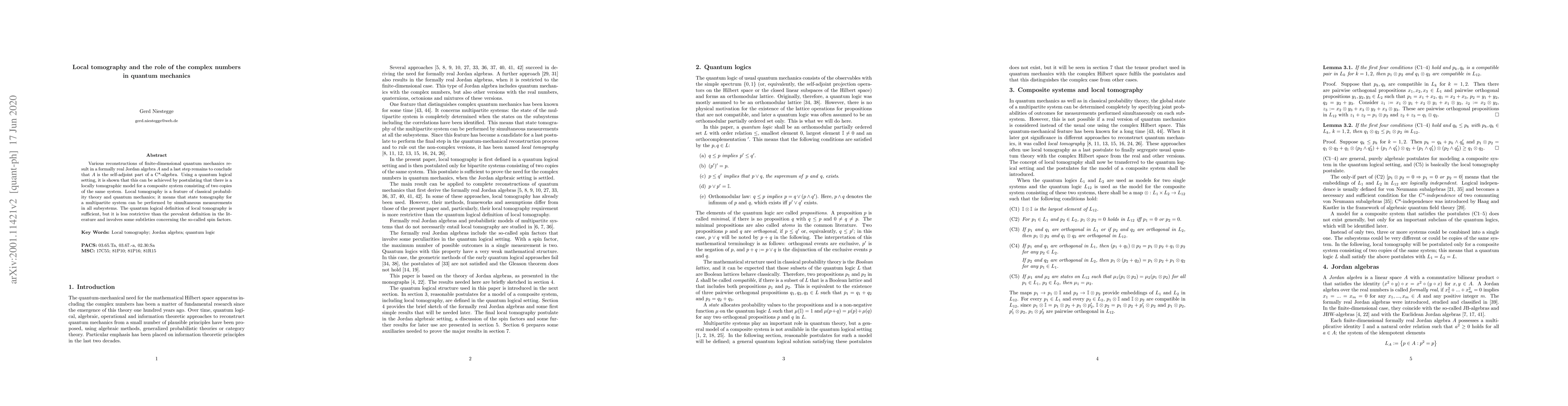 Various reconstructions of finite-dimensional quantum mechanics result in a formally real Jordan algebra A and a last step remains to conclude that A is the self-adjoint part of a C*-algebra. Using a quantum logical setting, it is shown that this can be achieved by postulating that there is a locally tomographic model for a composite system consisting of two copies of the same system. Local tomography is a feature of classical probability theory and quantum mechanics; it means that state tomography for a multipartite system can be performed by simultaneous measurements in all subsystems. The quantum logical definition of local tomography is sufficient, but it is less restictive than the prevalent definition in the literature and involves some subtleties concerning the so-called spin factors.