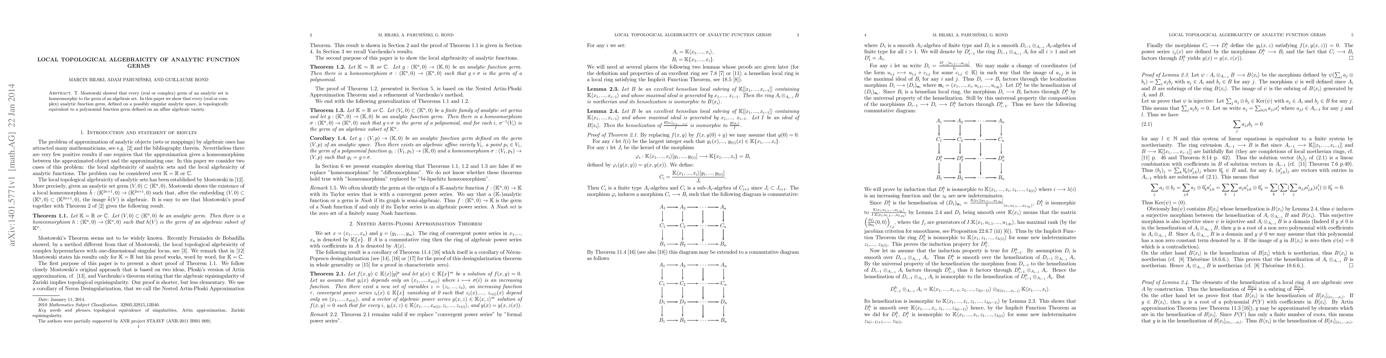 Summary: This paper extends T. Mostowski's result on analytic set germs to function germs, proving that any analytic function germ on a singular analytic space is topologically equivalent to a polynomial function germ on an affine algebraic variety. This establishes a local topological algebraicity for analytic function germs.