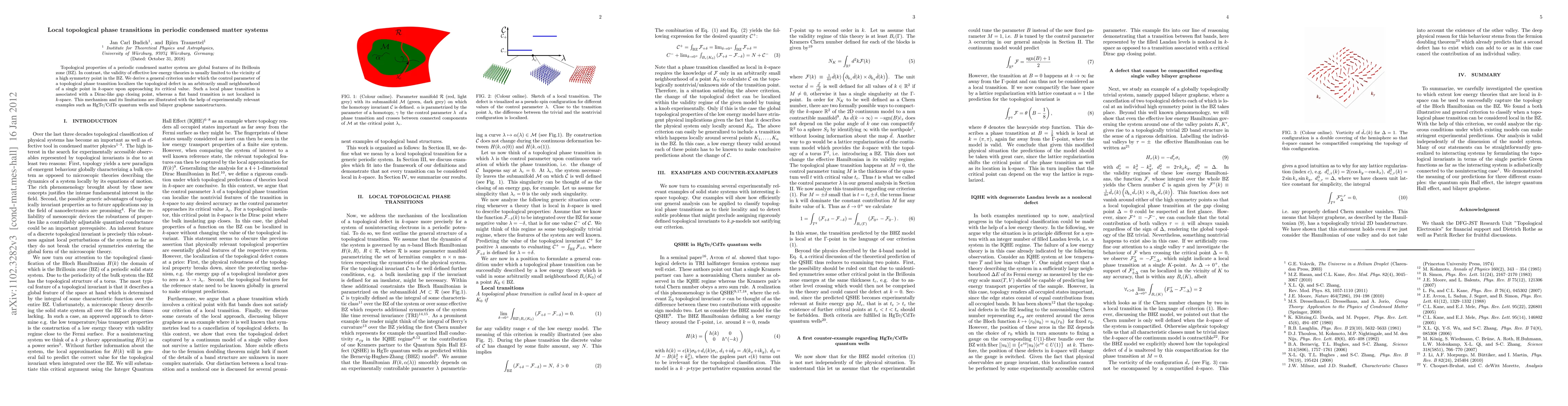 This paper derives a criterion for local topological phase transitions in periodic condensed matter systems, showing that such transitions localize topological defects near high symmetry points in the Brillouin zone. Examples from HgTe/CdTe quantum wells and bilayer graphene demonstrate this mechanism, contrasting it with non-localized flat band transitions.