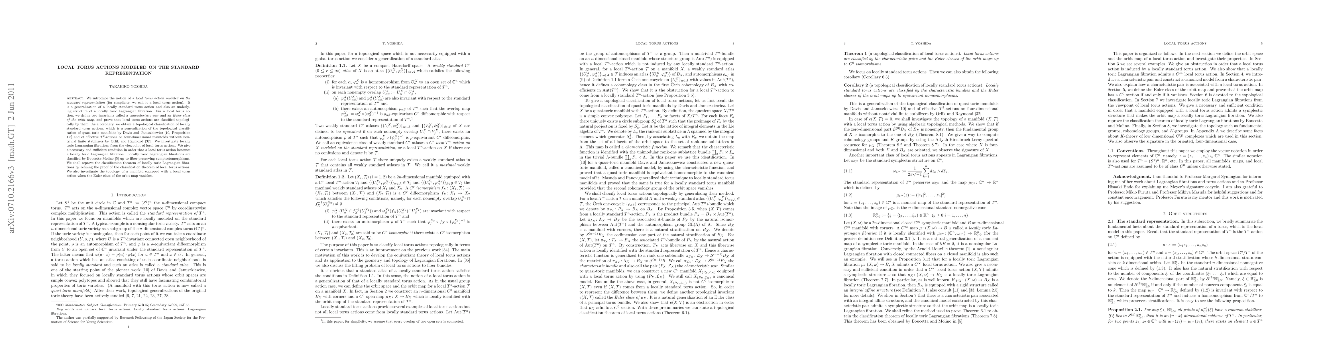 We introduce the notion of a local torus action modeled on the standard representation (for simplicity, we call it a local torus action). It is a generalization of a locally standard torus action and also an underlying structure of a locally toric Lagrangian fibration. For a local torus action, we define two invariants called a characteristic pair and an Euler class of the orbit map, and prove that local torus actions are classified topologically by them. As a corollary, we obtain a topological classification of locally standard torus actions, which is a generalization of the topological classification of quasi-toric manifolds by Davis and Januszkiewicz and of effective two-dimensional torus actions on four-dimensional manifolds without nontrivial finite stabilizers by Orlik and Raymond. We investigate locally toric Lagrangian fibrations from the viewpoint of local torus actions. We give a necessary and sufficient condition in order that a local torus action becomes a locally toric Lagrangian fibration. Locally toric Lagrangian fibrations are classified by Boucetta and Molino up to fiber-preserving symplectomorphisms. We shall reprove the classification theorem of locally toric Lagrangian fibrations by refining the proof of the classification theorem of local torus actions. We also investigate the topology of a manifold equipped with a local torus action when the Euler class of the orbit map vanishes.