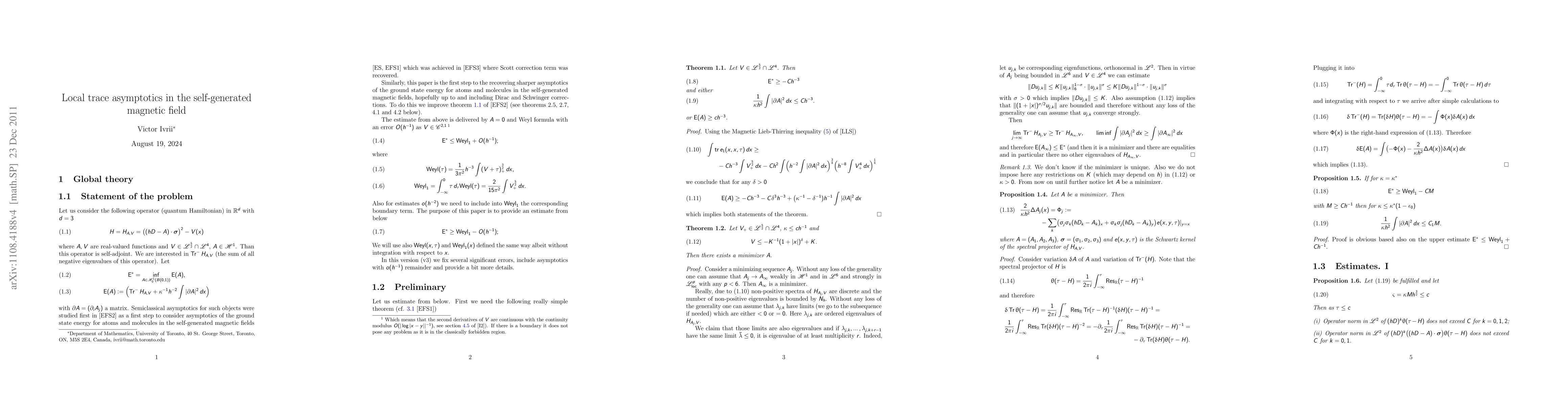 This paper studies the semiclassical asymptotics of the local trace for a 3D Schrödinger operator with a self-generated magnetic field, yielding a Weyl expression with an O(h^{-1}) error under standard Hamiltonian trajectory conditions. Compared to previous versions, it corrects errors, adds new results, and provides additional details.