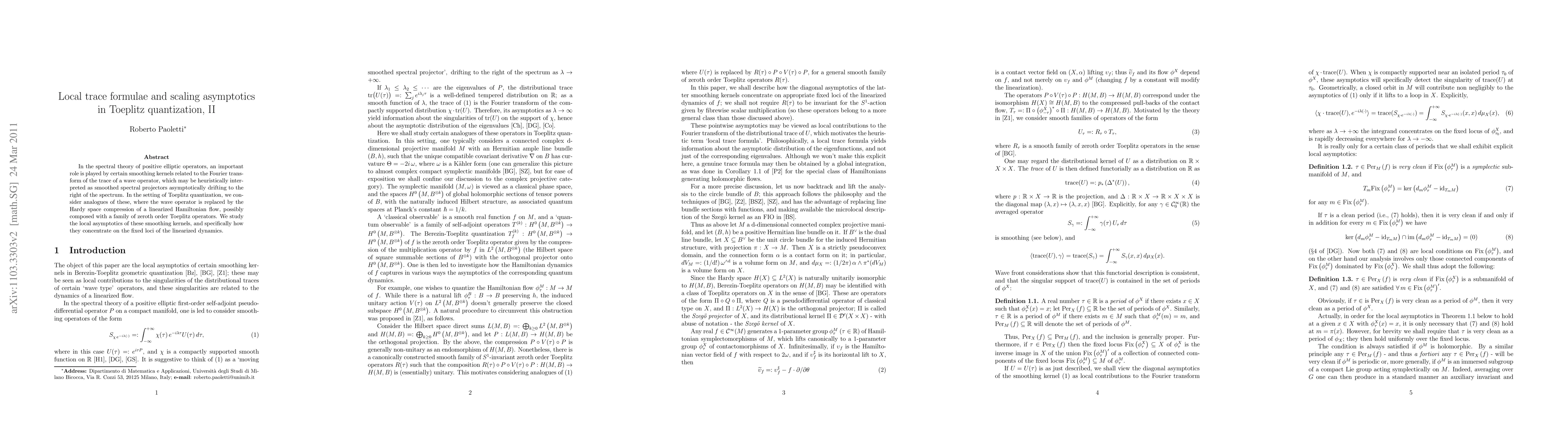 This paper investigates the local asymptotics of smoothing kernels in Toeplitz quantization, focusing on the concentration of these kernels on the fixed loci of linearized dynamics, replacing wave operators with Hardy space compressions of a linearized Hamiltonian flow.
