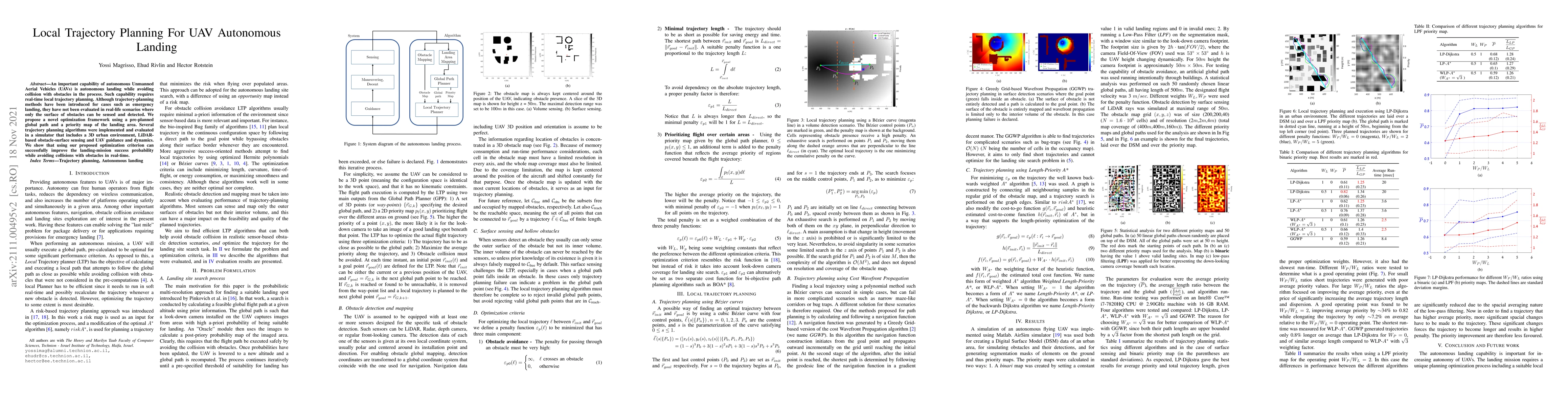 An important capability of autonomous Unmanned Aerial Vehicles (UAVs) is autonomous landing while avoiding collision with obstacles in the process. Such capability requires real-time local trajectory planning. Although trajectory-planning methods have been introduced for cases such as emergency landing, they have not been evaluated in real-life scenarios where only the surface of obstacles can be sensed and detected. We propose a novel optimization framework using a pre-planned global path and a priority map of the landing area. Several trajectory planning algorithms were implemented and evaluated in a simulator that includes a 3D urban environment, LiDAR-based obstacle-surface sensing and UAV guidance and dynamics. We show that using our proposed optimization criterion can successfully improve the landing-mission success probability while avoiding collisions with obstacles in real-time.
