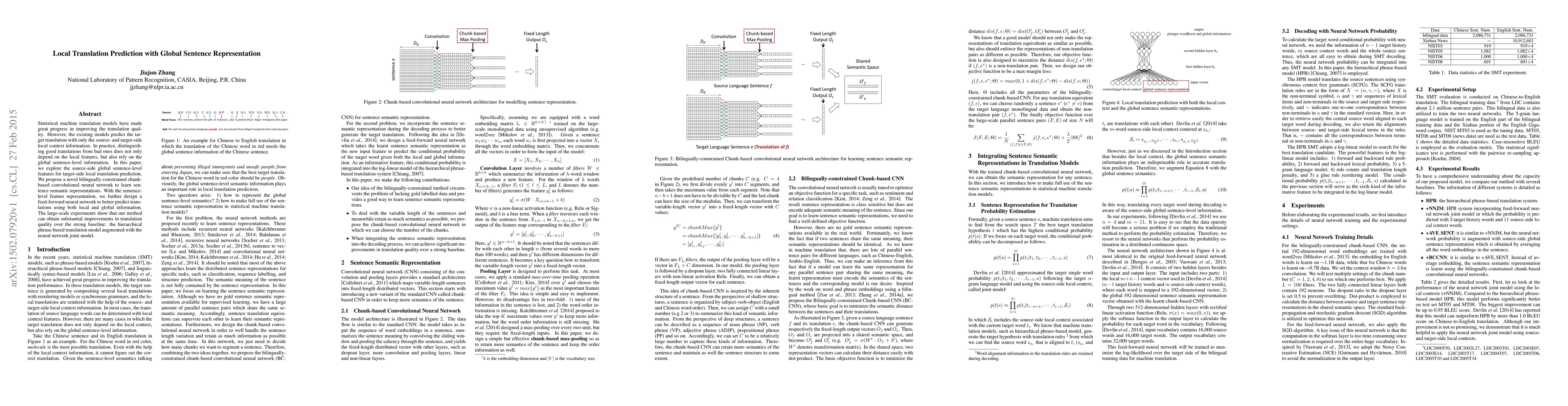 This paper proposes a novel bilingually-constrained chunk-based convolutional neural network to incorporate global sentence-level features into local translation prediction, achieving better translation quality compared to traditional hierarchical phrase-based models enhanced with neural networks. The method demonstrates significant improvements in translation accuracy through the integration of both local and global context information.