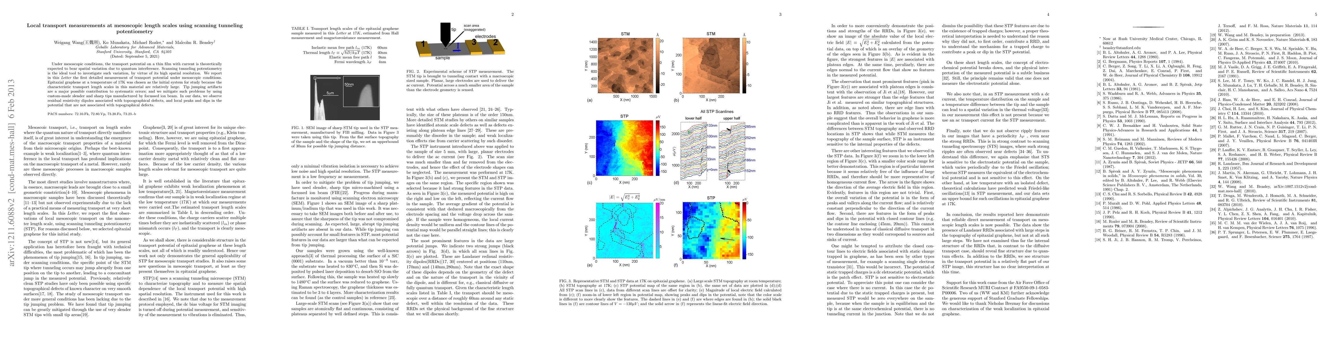 Under mesoscopic conditions, the transport potential on a thin film with current is theoretically expected to bear spatial variation due to quantum interference. Scanning tunneling potentiometry is the ideal tool to investigate such variation, by virtue of its high spatial resolution. We report in this {\it Letter} the first detailed measurement of transport potential under mesoscopic conditions. Epitaxial graphene at a temperature of 17K was chosen as the initial system for study because the characteristic transport length scales in this material are relatively large. Tip jumping artifacts are a major possible contribution to systematic errors; and we mitigate such problems by using custom-made slender and sharp tips manufactured by focussed ion beam. In our data, we observe residual resistivity dipoles associated with topoographical defects, and local peaks and dips in the potential that are not associated with topographical defects.