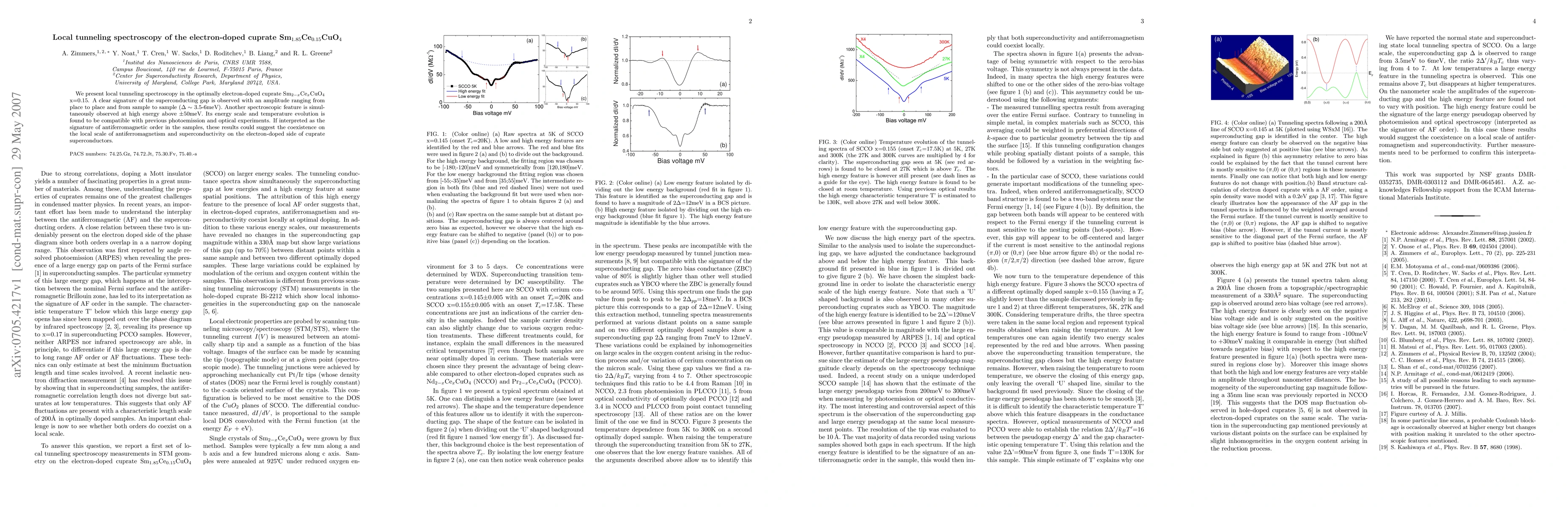 We present local tunneling spectroscopy in the optimally electron-doped cuprate Sm2-xCexCuO4 x=0.15. A clear signature of the superconducting gap is observed with an amplitude ranging from place to place and from sample to sample (Delta~3.5-6meV). Another spectroscopic feature is simultaneously observed at high energy above \pm 50meV. Its energy scale and temperature evolution is found to be compatible with previous photoemission and optical experiments. If interpreted as the signature of antiferromagnetic order in the samples, these results could suggest the coexistence on the local scale of antiferromagnetism and superconductivity on the electron-doped side of cuprate superconductors.