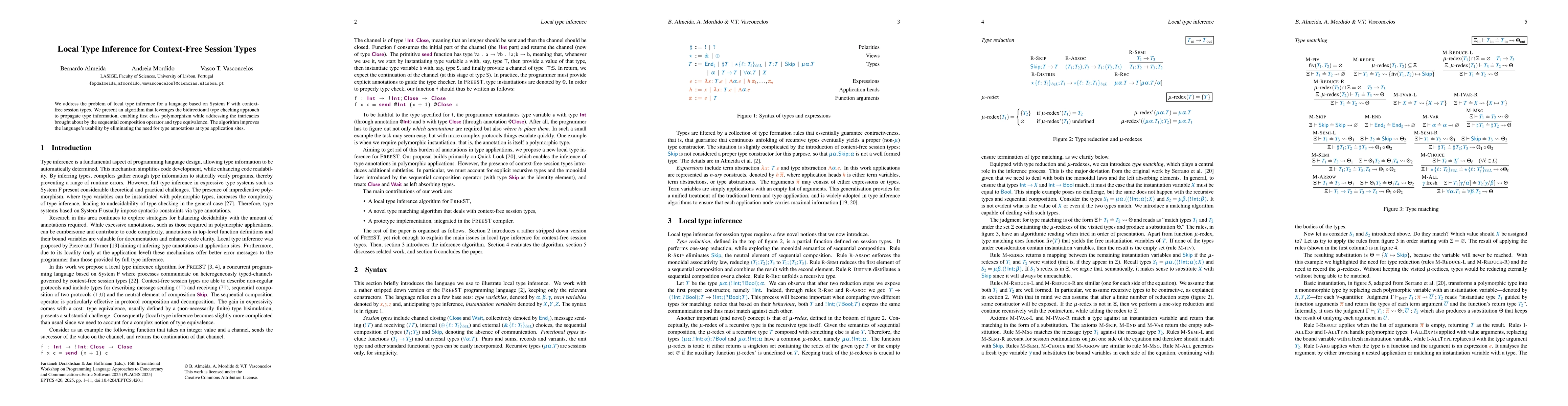 A bidirectional type checking-based algorithm for local type inference in a System F extension with context-free session types.