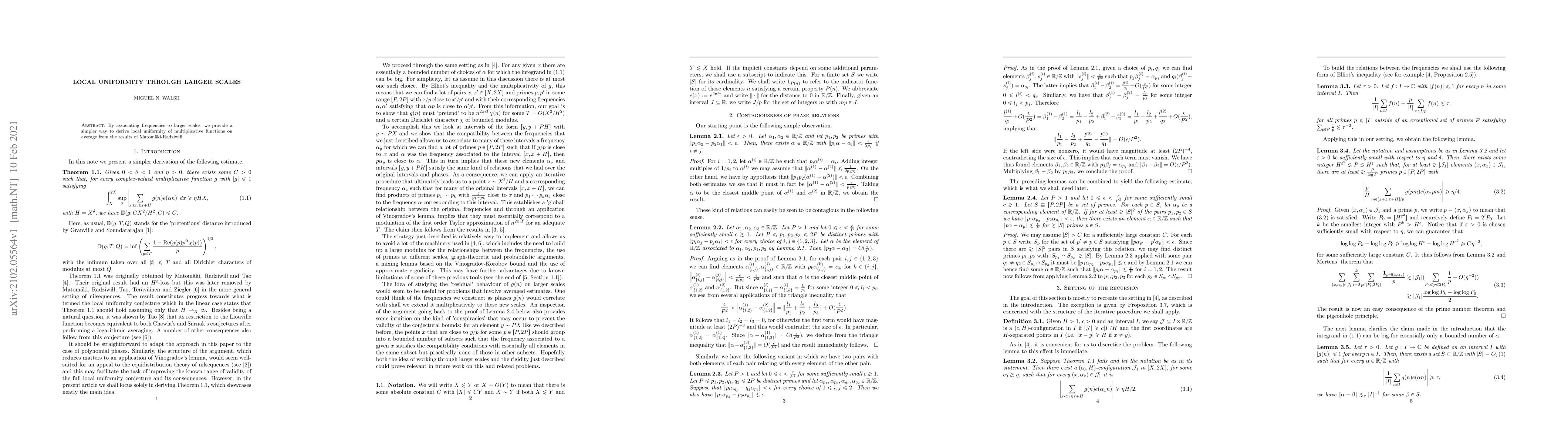 By associating frequencies to larger scales, we provide a simpler way to derive local uniformity of multiplicative functions on average from the results of Matom\"aki-Radziwill.