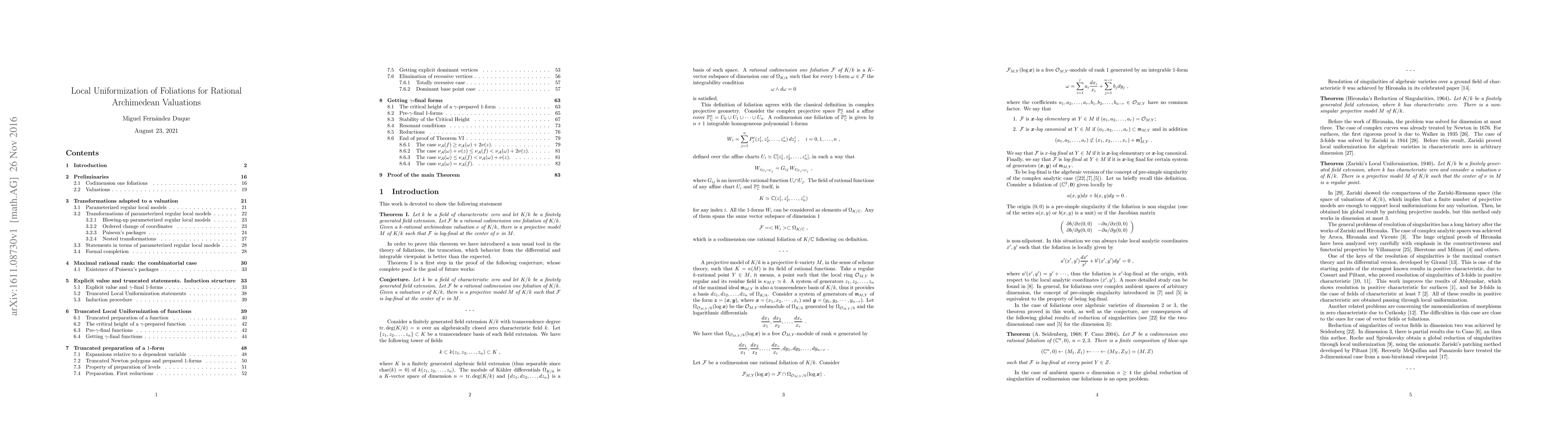 This paper proves the local uniformization of codimension one foliations in any ambient dimension, focusing on rational archimedean valuations, extending previous results for dimensions 2 and 3. The broader problem of higher-dimensional ambient dimensions remains open.