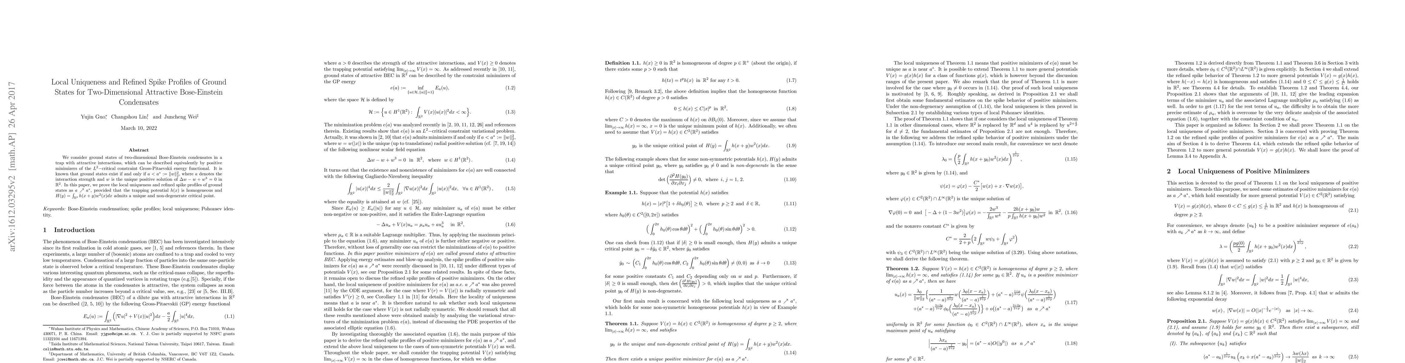 This paper proves local uniqueness and refined spike profiles for ground states of two-dimensional attractive Bose-Einstein condensates near the critical interaction strength $a^*$, under the condition that the trapping potential has a unique and non-degenerate critical point. The study focuses on the behavior of these states as the interaction strength approaches $a^*$.