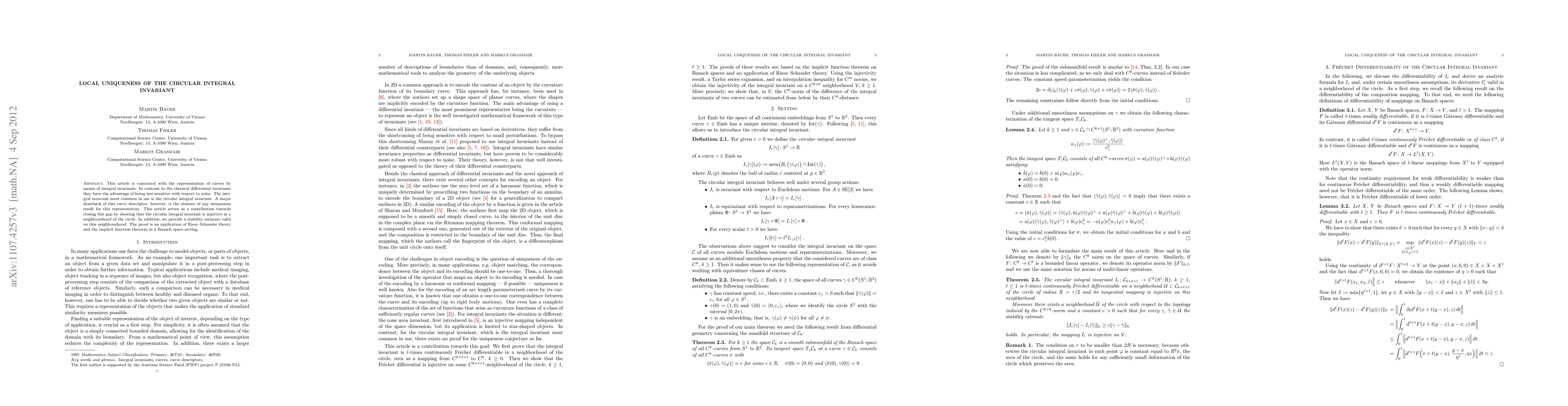This article is concerned with the representation of curves by means of integral invariants. In contrast to the classical differential invariants they have the advantage of being less sensitive with respect to noise. The integral invariant most common in use is the circular integral invariant. A major drawback of this curve descriptor, however, is the absence of any uniqueness result for this representation. This article serves as a contribution towards closing this gap by showing that the circular integral invariant is injective in a neighbourhood of the circle. In addition, we provide a stability estimate valid on this neighbourhood. The proof is an application of Riesz-Schauder theory and the implicit function theorem in a Banach space setting.