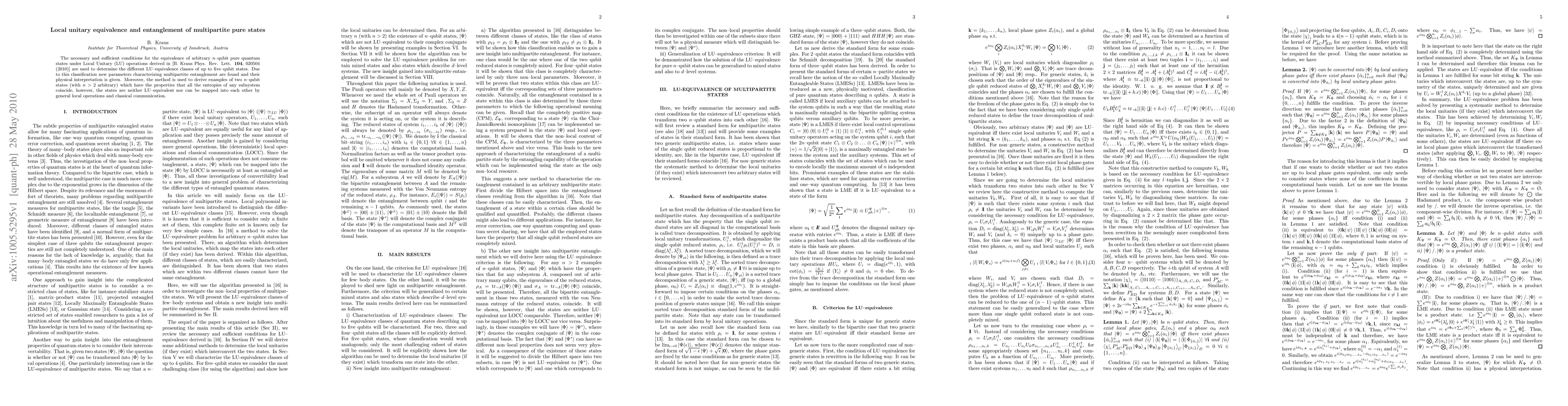 The necessary and sufficient conditions for the equivalence of arbitrary n-qubit pure quantum states under Local Unitary (LU) operations derived in [B. Kraus Phys. Rev. Lett. 104, 020504 (2010)] are used to determine the different LU-equivalence classes of up to five-qubit states. Due to this classification new parameters characterizing multipartite entanglement are found and their physical interpretation is given. Moreover, the method is used to derive examples of two n-qubit states (with n>2 arbitrary) which have the properties that all the entropies of any subsystem coincide, however, the states are neither LU-equivalent nor can be mapped into each other by general local operations and classical communication.