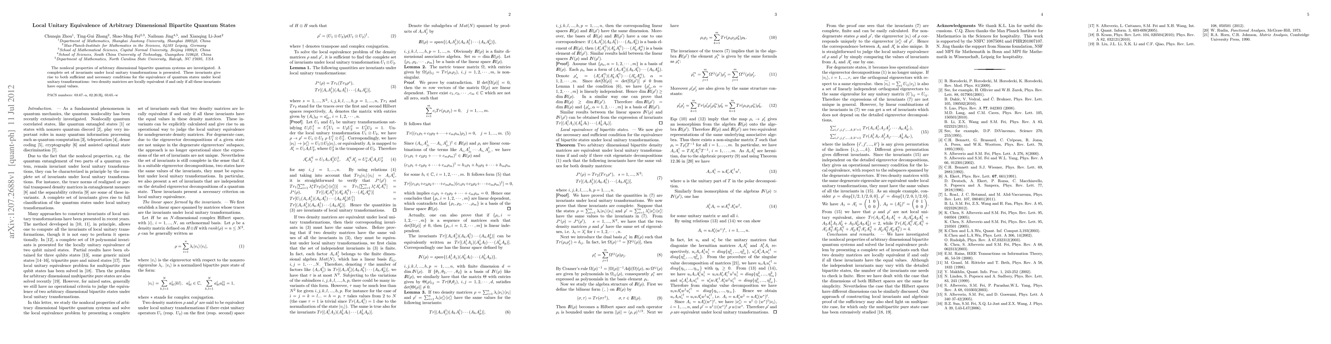 This paper investigates the nonlocal properties of arbitrary dimensional bipartite quantum systems and presents a complete set of invariants under local unitary transformations. It establishes that two density matrices are locally equivalent if and only if all these invariants are equal, providing both necessary and sufficient conditions for local unitary equivalence.