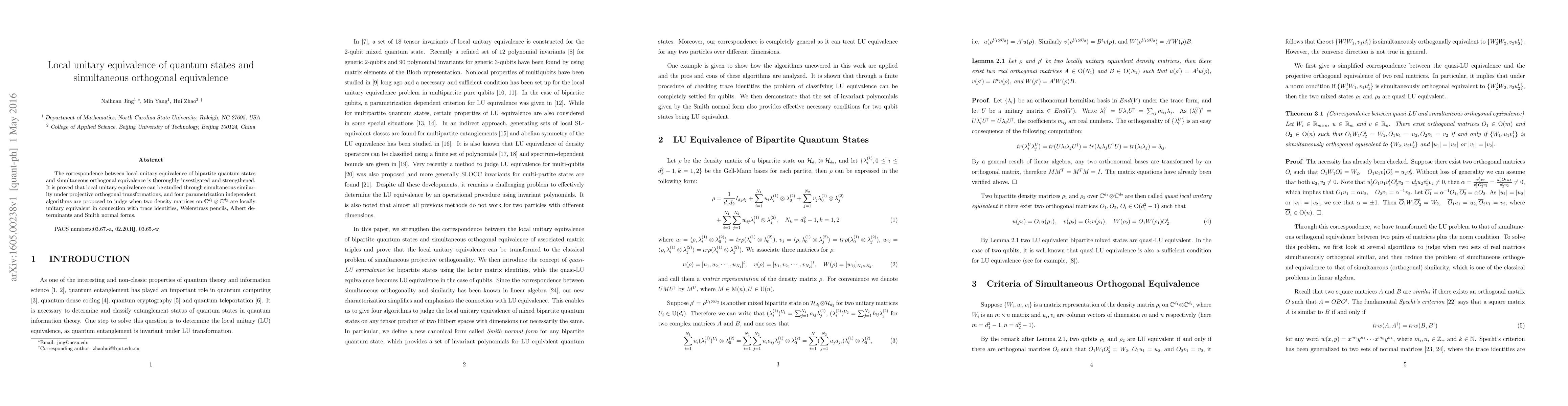 This paper investigates the relationship between local unitary equivalence of bipartite quantum states and simultaneous orthogonal equivalence, proving that the former can be studied via simultaneous similarity under projective orthogonal transformations. Four independent algorithms are proposed to determine local unitary equivalence using trace identities, Weierstrass pencils, Albert determinants, and Smith normal forms.