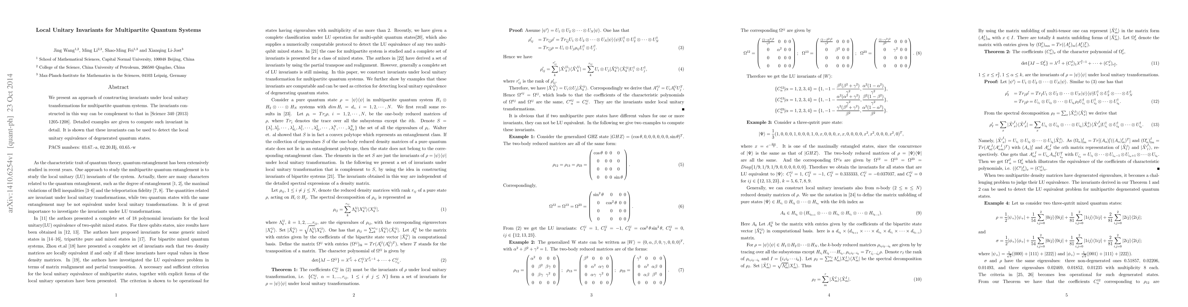 This paper introduces a method for constructing invariants under local unitary transformations for multipartite quantum systems, providing a complementary approach to existing methods. These invariants are demonstrated to effectively detect local unitary equivalence of degenerate quantum states through detailed examples.