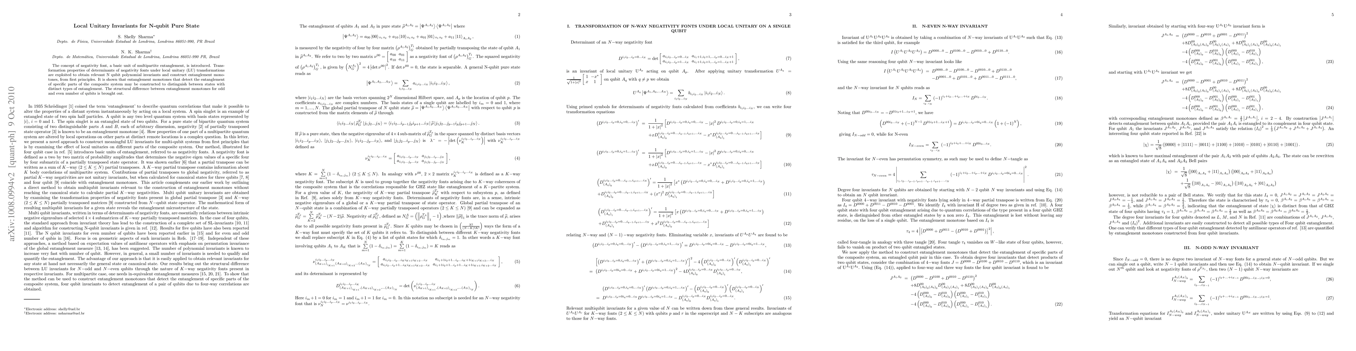 This paper derives local unitary invariant polynomials for N-qubit pure states from fundamental principles. It introduces a basic unit of entanglement called "negativity font" and utilizes its transformation properties under local unitary transformations to establish multi-qubit invariants based on determinants of these fonts.