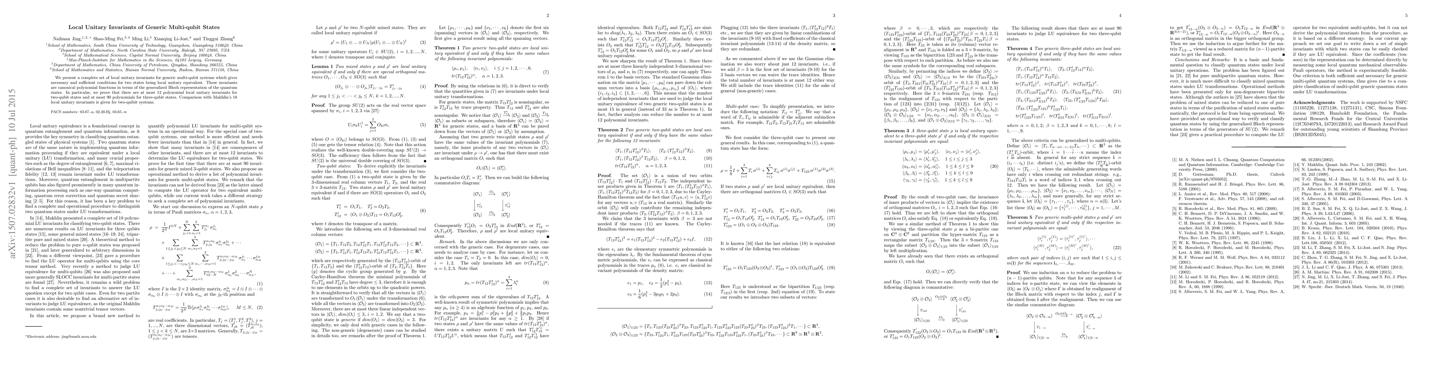 This paper introduces a comprehensive set of local unitary invariants for generic multi-qubit systems, providing necessary and sufficient conditions for local unitary equivalence. The invariants are polynomial functions derived from the generalized Bloch representation of quantum states, with specific counts of invariants for two- and three-qubit systems.