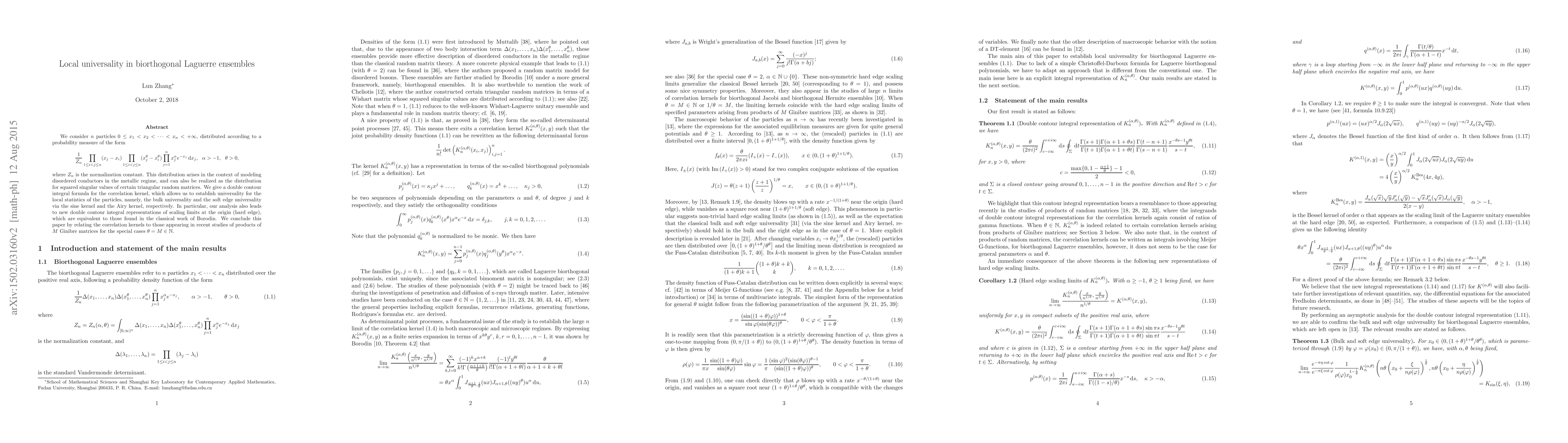 This research paper establishes universality in a specific distribution of particles, showing that their local statistics follow general patterns regardless of the exact parameters, with implications for understanding disordered conductors and random matrix theory.