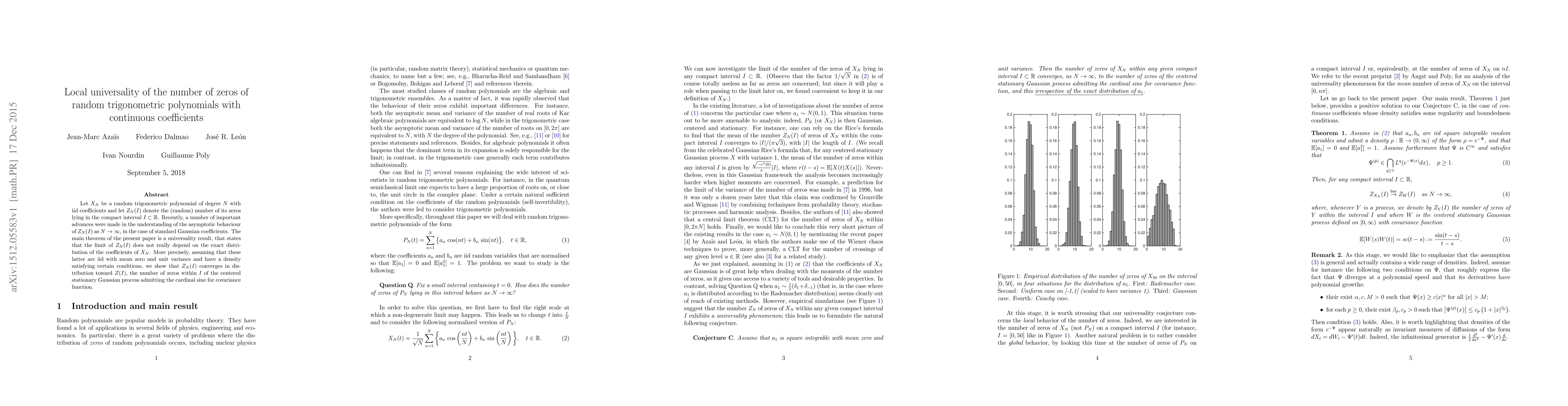 This paper establishes a universality result for the number of zeros of random trigonometric polynomials, showing that the asymptotic behavior of zero counts does not depend on the specific distribution of coefficients, provided they meet certain conditions. The convergence in distribution is towards a Gaussian process with a cardinal sine covariance function.