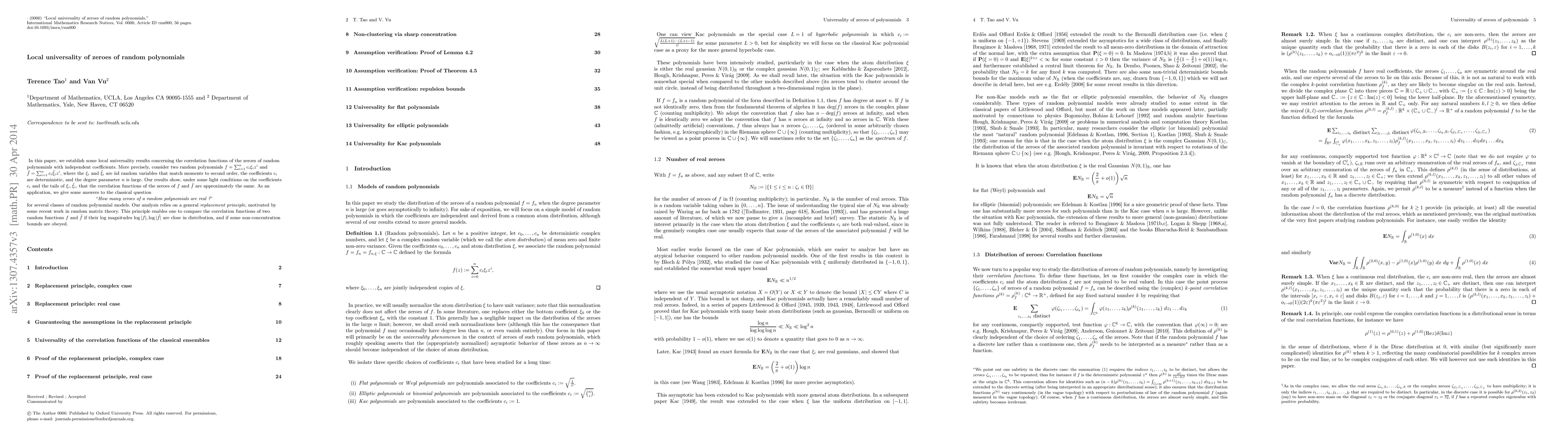 This paper establishes local universality of zero correlations for random polynomials with independent coefficients, demonstrating that under certain conditions, the correlation functions of their zeroes are nearly identical. The analysis employs a replacement principle inspired by random matrix theory to address the question of the real zero count for various random polynomial models.
