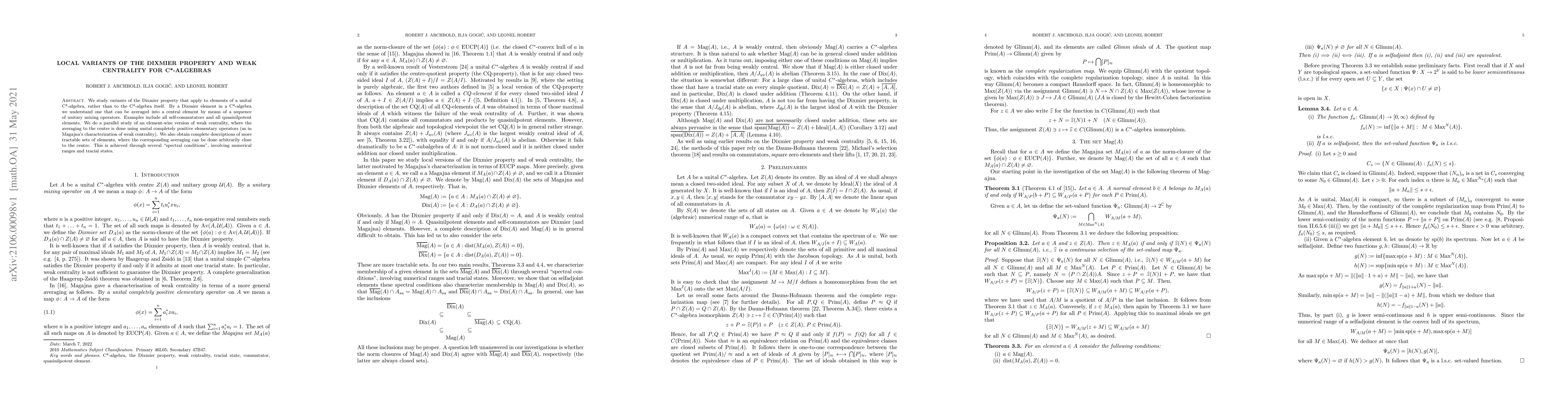 This paper investigates local variants of the Dixmier property for elements in unital C*-algebras, focusing on elements that can be averaged into central elements via sequences of unitary operators. It also examines an element-wise version of weak centrality, employing unital completely positive elementary operators, and provides detailed descriptions of sets where averaging can approximate the center through spectral conditions involving numerical ranges and tracial states.