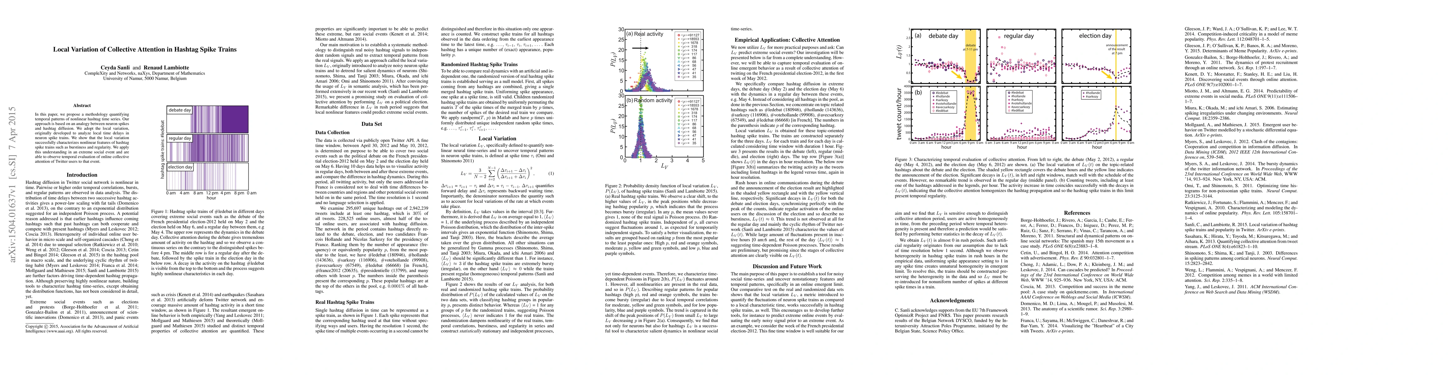 This paper develops a methodology to quantify nonlinear temporal patterns in hashtag spike trains by using local variation, originally designed for neuron spike analysis, to characterize burstiness and regularity. The approach is applied to an extreme social event, revealing the temporal dynamics of collective attention on Twitter.