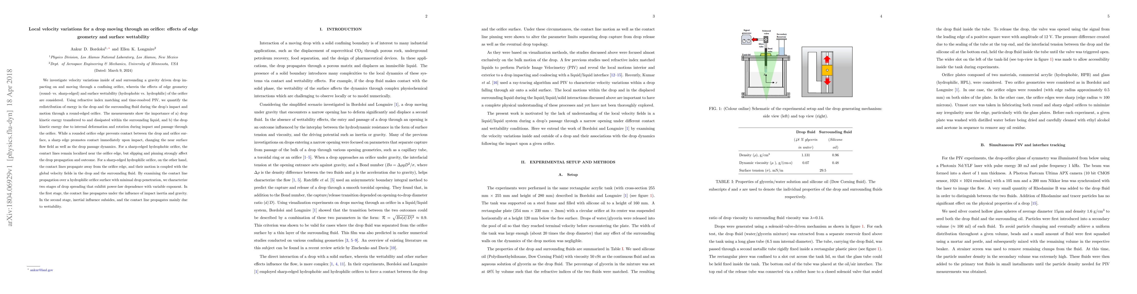 This study examines how local velocity variations occur within and around a gravity-driven drop as it moves through an orifice, focusing on the effects of orifice edge geometry (round vs. sharp) and surface wettability (hydrophobic vs. hydrophilic). The research reveals distinct flow dynamics and energy redistribution influenced by the orifice characteristics, highlighting the interplay between drop kinetic energy, internal deformation, and the contact line behavior.