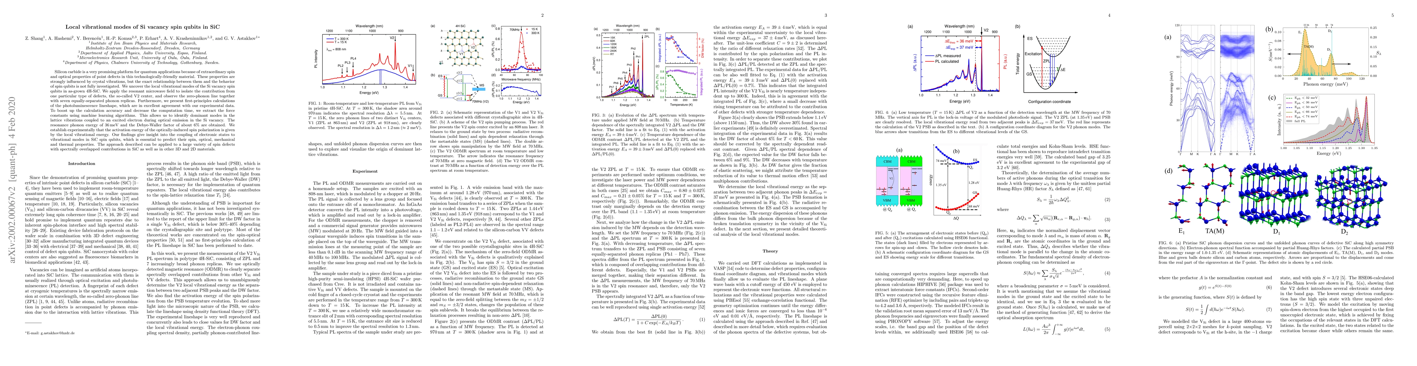 Silicon carbide is a very promising platform for quantum applications because of extraordinary spin and optical properties of point defects in this technologically-friendly material. These properties are strongly influenced by crystal vibrations, but the exact relationship between them and the behavior of spin qubits is not fully investigated. We uncover the local vibrational modes of the Si vacancy spin qubits in as-grown 4H-SiC. We apply the resonant microwave field to isolate the contribution from one particular type of defects, the so-called V2 center, and observe the zero-phonon line together with seven equally-separated phonon replicas. Furthermore, we present first-principles calculations of the photoluminescence lineshape, which are in excellent agreement with our experimental data. To boost up the calculation accuracy and decrease the computation time, we extract the force constants using machine learning algorithms. This allows us to identify dominant modes in the lattice vibrations coupled to an excited electron during optical emission in the Si vacancy. The resonance phonon energy of 36 meV and the Debye-Waller factor of about 6% are obtained. We establish experimentally that the activation energy of the optically-induced spin polarization is given by the local vibrational energy. Our findings give insight into the coupling of electronic states to vibrational modes in SiC spin qubits, which is essential to predict their spin, optical, mechanical and thermal properties. The approach described can be applied to a large variety of spin defects with spectrally overlapped contributions in SiC as well as in other 3D and 2D materials.
