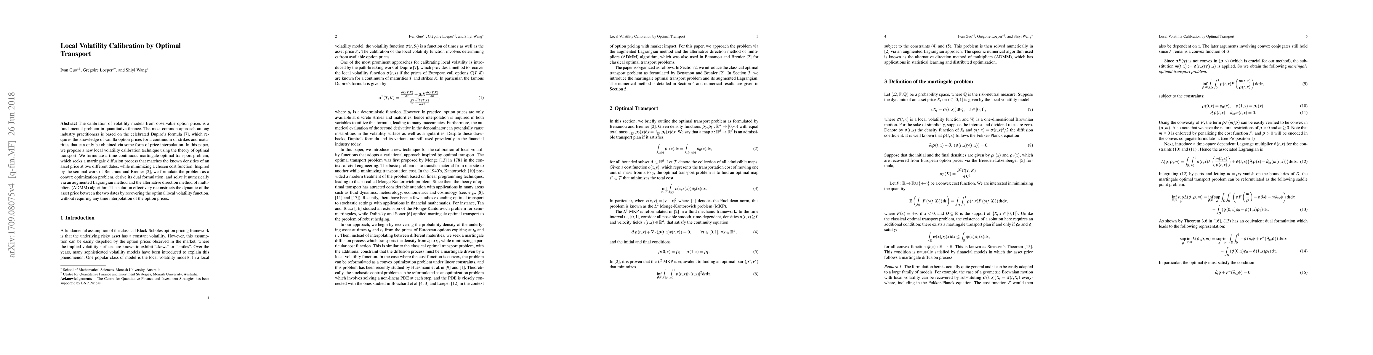 This paper introduces a novel local volatility calibration method using optimal transport theory, formulating a continuous martingale optimal transport problem to match asset price densities at two dates. It solves the problem via convex optimization and ADMM, reconstructing the asset price dynamics and local volatility without option price interpolation.