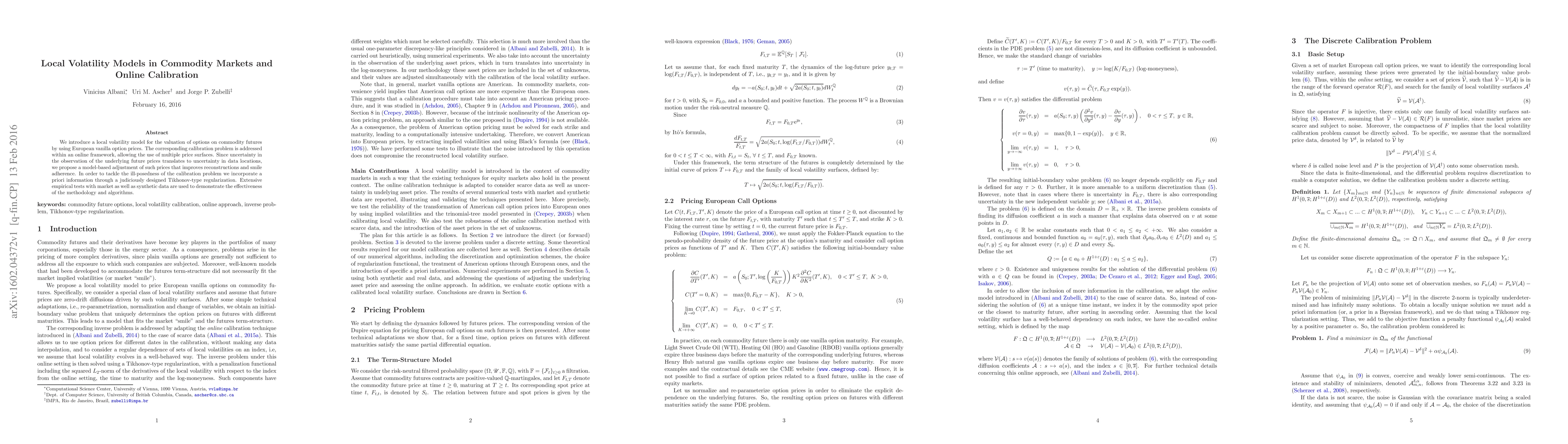 We introduce a local volatility model for the valuation of options on commodity futures by using European vanilla option prices. The corresponding calibration problem is addressed within an online framework, allowing the use of multiple price surfaces. Since uncertainty in the observation of the underlying future prices translates to uncertainty in data locations, we propose a model-based adjustment of such prices that improves reconstructions and smile adherence. In order to tackle the ill-posedness of the calibration problem we incorporate a priori information through a judiciously designed Tikhonov-type regularization. Extensive empirical tests with market as well as synthetic data are used to demonstrate the effectiveness of the methodology and algorithms.
