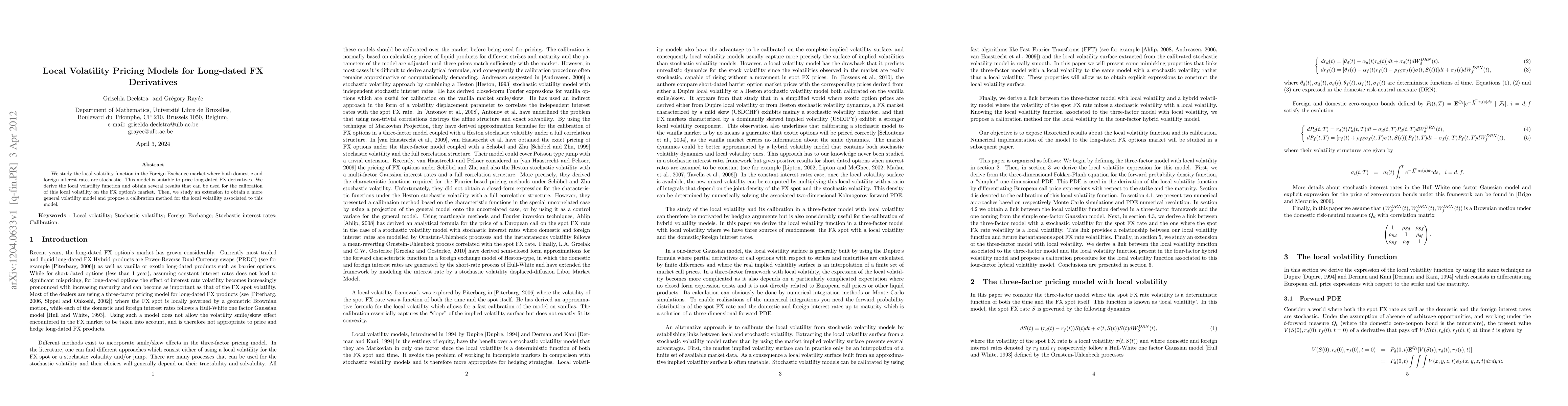 This paper investigates local volatility models for pricing long-dated FX derivatives under stochastic interest rates. It derives the local volatility function and proposes a calibration method for the FX option market, extending the model for a more general volatility approach.