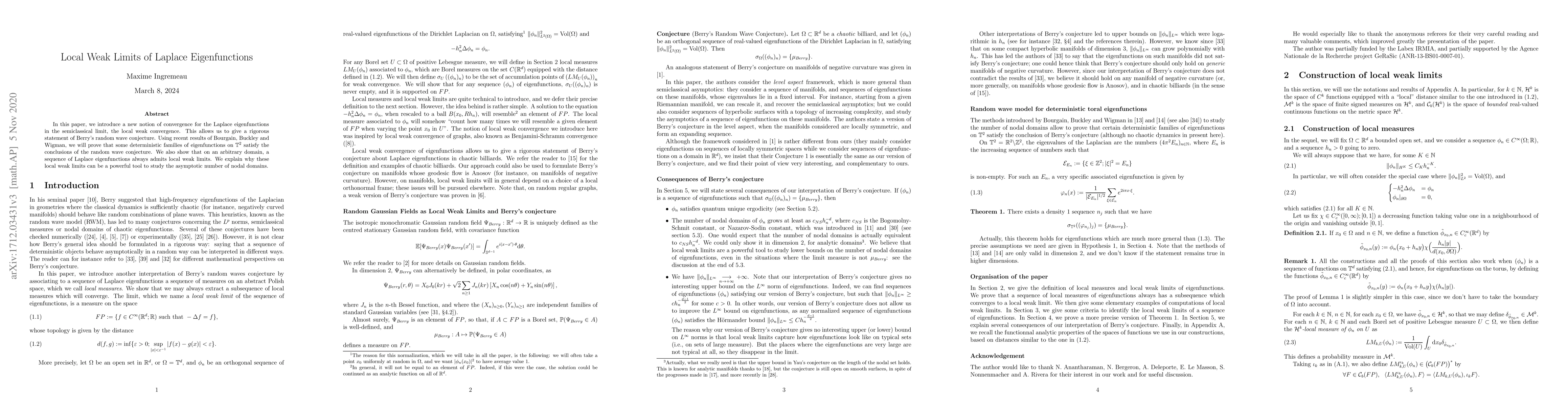 This paper introduces local weak convergence as a new notion for Laplace eigenfunctions in the semiclassical limit, rigorously supporting Berry's random wave conjecture. It demonstrates that certain eigenfunctions on $\mathbb{T}^2$ satisfy the conjecture and shows that any sequence of Laplace eigenfunctions admits local weak limits, which are useful for studying the asymptotic number of nodal domains.