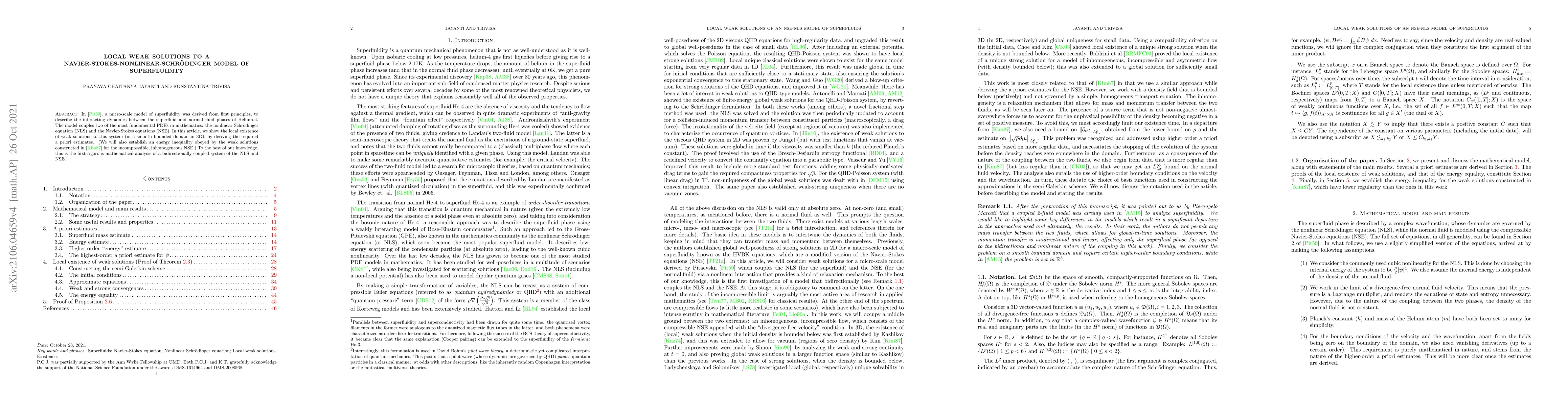 This paper rigorously establishes the local existence of weak solutions to a coupled system of the nonlinear Schrödinger equation and the Navier-Stokes equations, modeling superfluidity in Helium-4. The authors derive necessary a priori estimates and establish an energy inequality, marking the first mathematical analysis of such a bidirectionally coupled system.