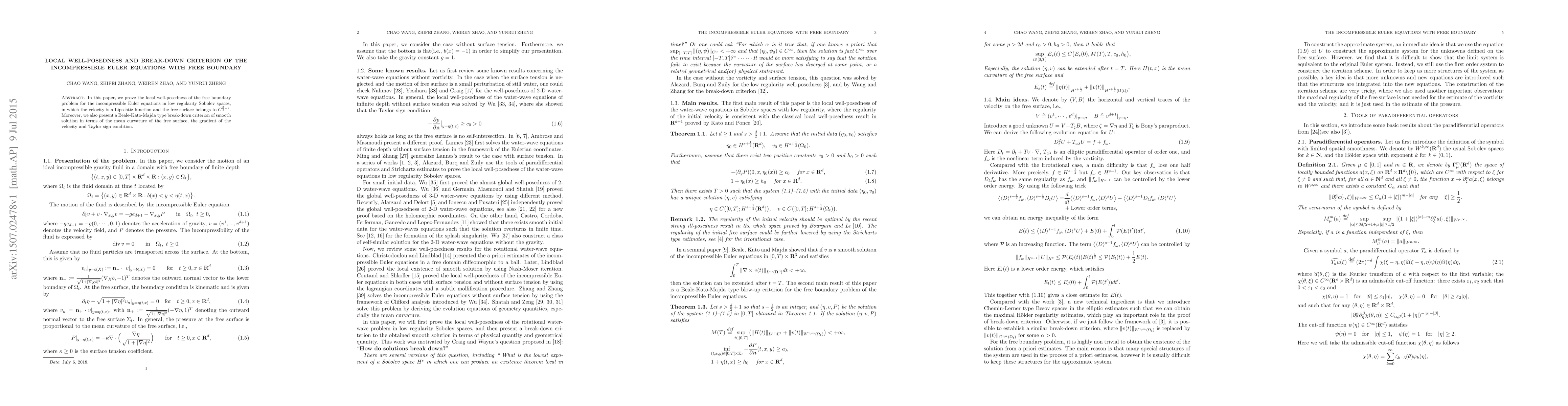 This paper establishes local well-posedness for the free boundary incompressible Euler equations in low regularity Sobolev spaces and introduces a Beale-Kato-Majda type criterion for solution break-down based on mean curvature, velocity gradient, and Taylor sign condition.