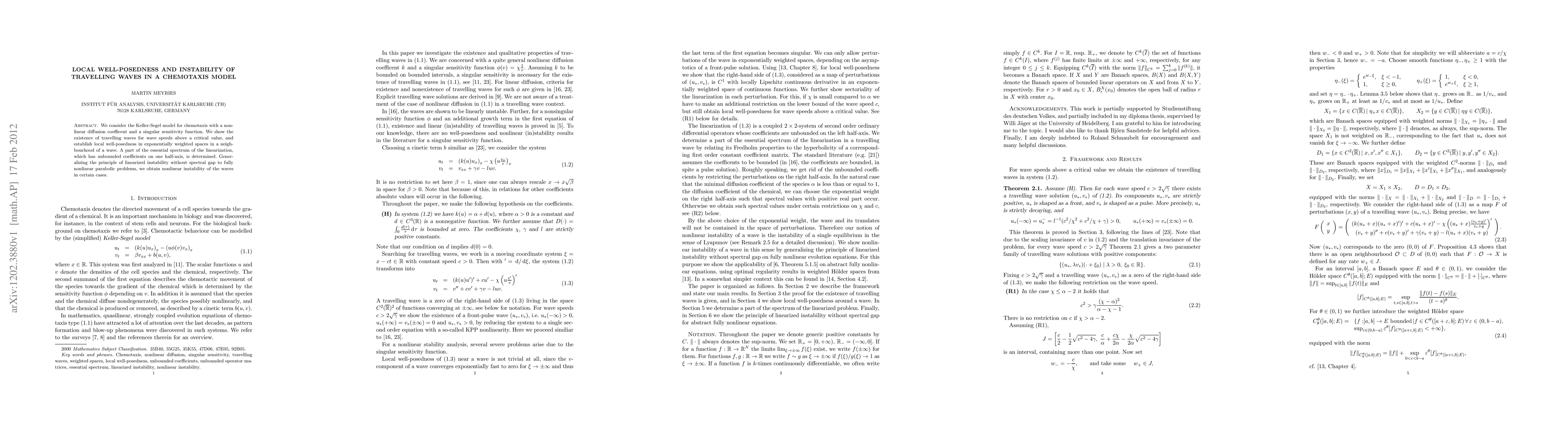 This paper investigates travelling waves in a chemotaxis model with nonlinear diffusion and instability, showing local well-posedness for wave speeds above a critical value and nonlinear instability in certain cases.