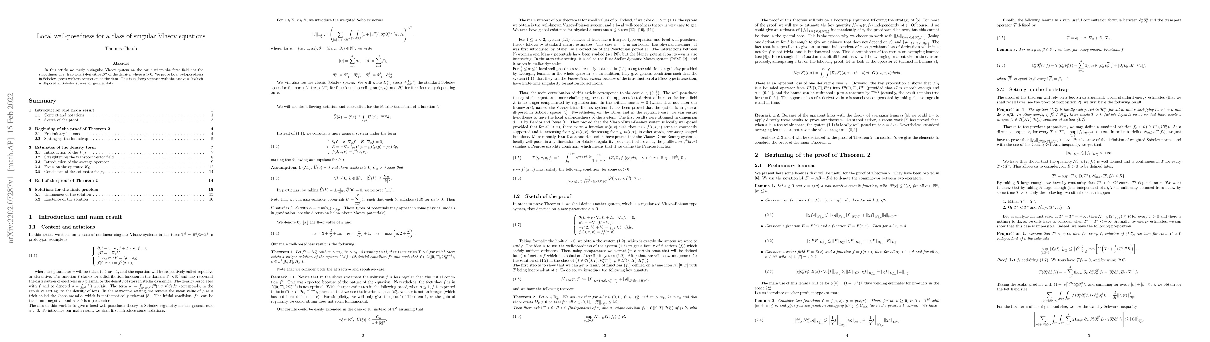 This paper proves local well-posedness for a singular Vlasov system on the torus where the force field depends on a fractional derivative of the density. The authors demonstrate that the system is well-posed in Sobolev spaces without restrictions on the initial data, contrasting sharply with the ill-posedness when the force field is linear.