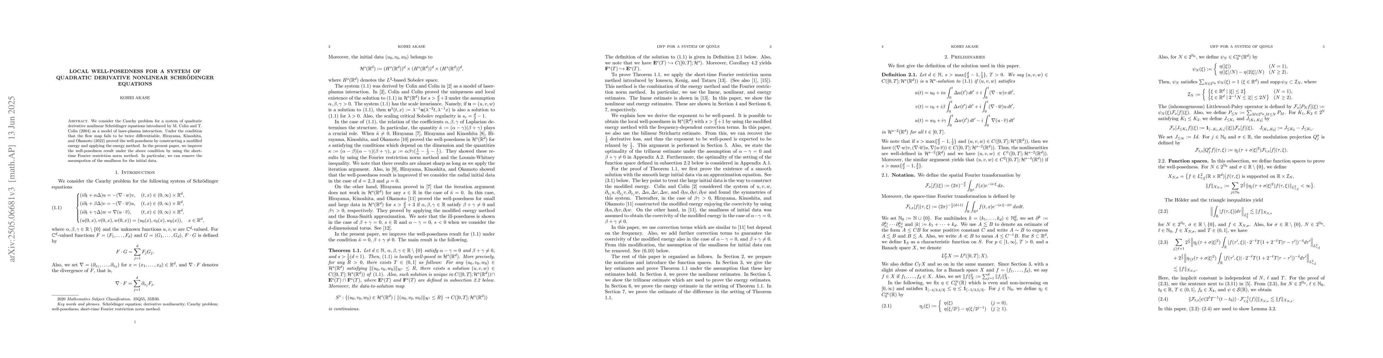 We consider the Cauchy problem for a system of quadratic derivative nonlinear Schr\"odinger equations introduced by M. Colin and T. Colin (2004) as a model of laser-plasma interaction. Under the condition that the flow map fails to be twice differentiable, Hirayama, Kinoshita, and Okamoto (2022) proved the well-posedness by constructing a modified energy and applying the energy method. In the present paper, we improve the well-posedness result under the above condition by using the short-time Fourier restriction norm method.
