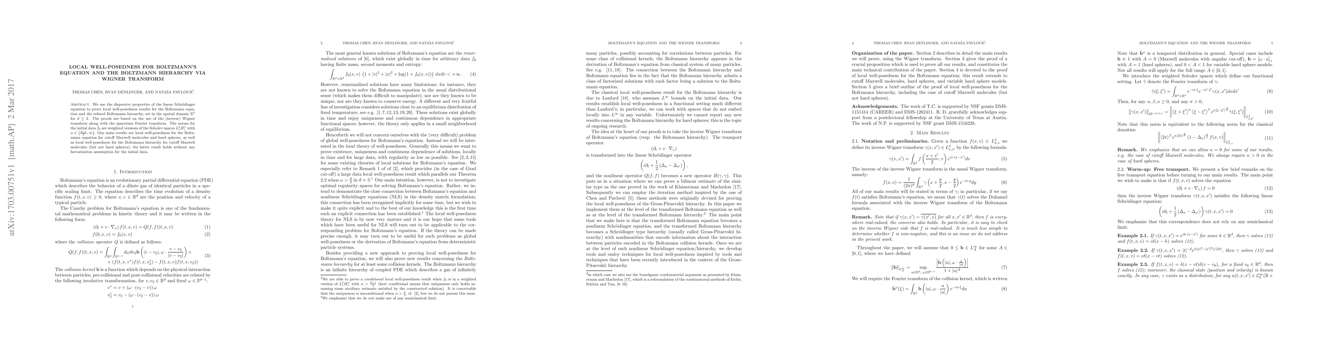 This paper proves local well-posedness for the Boltzmann equation and the Boltzmann hierarchy using the dispersive properties of the linear Schrödinger equation and the (inverse) Wigner transform. The results apply to cutoff Maxwell molecules and hard spheres, with specific conditions on the initial data.