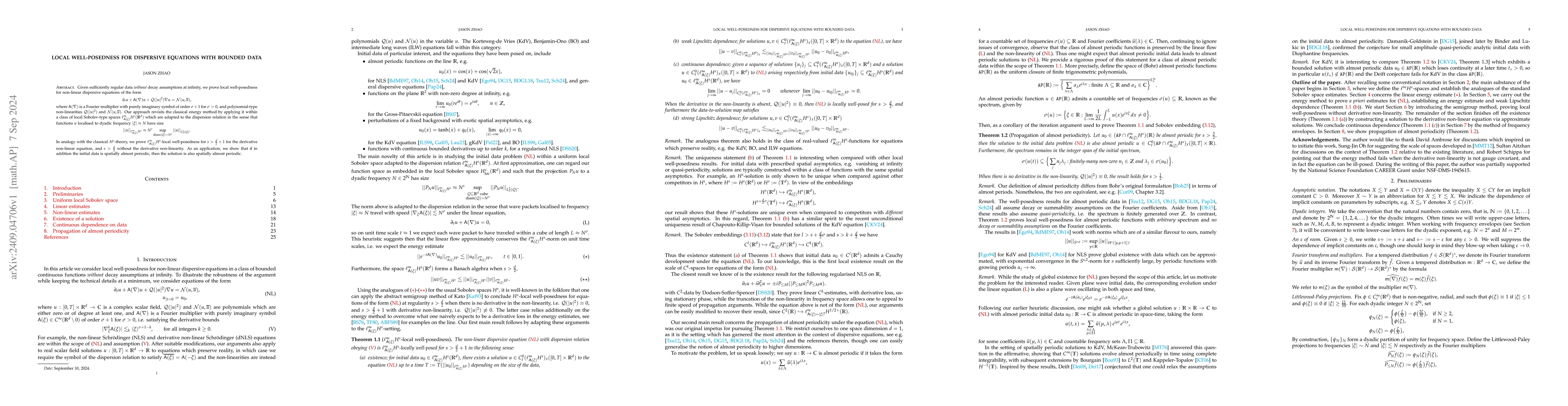 This paper proves local well-posedness for non-linear dispersive equations without decay assumptions using a novel application of the energy method in adapted local Sobolev spaces. It establishes well-posedness for certain regularity conditions, and shows that spatially almost periodic initial data yields spatially almost periodic solutions.