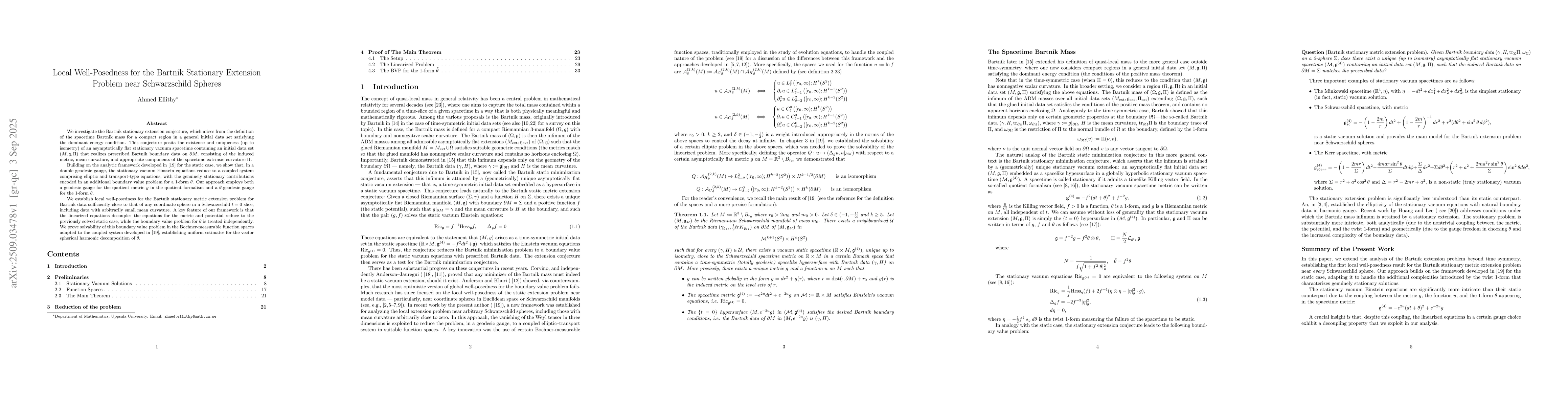 We investigate the Bartnik stationary extension conjecture, which arises from the definition of the spacetime Bartnik mass for a compact region in a general initial data set satisfying the dominant energy condition. This conjecture posits the existence and uniqueness (up to isometry) of an asymptotically flat stationary vacuum spacetime containing an initial data set $(M, \mathfrak{g}, \Pi)$ that realizes prescribed Bartnik boundary data on $\partial M$, consisting of the induced metric, mean curvature, and appropriate components of the spacetime extrinsic curvature $\Pi$. Building on the analytic framework developed in arXiv:2411.02801 for the static case, we show that, in a double geodesic gauge, the stationary vacuum Einstein equations reduce to a coupled system comprising elliptic and transport-type equations, with the genuinely stationary contributions encoded in an additional boundary value problem for a $1$-form $\theta$. Our approach employs both a geodesic gauge for the quotient metric $g$ in the quotient formalism and a $\theta$-geodesic gauge for the $1$-form $\theta$. We establish local well-posedness for the Bartnik stationary metric extension problem for Bartnik data sufficiently close to that of any coordinate sphere in a Schwarzschild ${t=0}$ slice, including data with arbitrarily small mean curvature. A key feature of our framework is that the linearized equations decouple: the equations for the metric and potential reduce to the previously solved static case, while the boundary value problem for $\theta$ is treated independently. We prove solvability of this boundary value problem in the Bochner-measurable function spaces adapted to the coupled system developed in arXiv:2411.02801, establishing uniform estimates for the vector spherical harmonic decomposition of $\theta$.