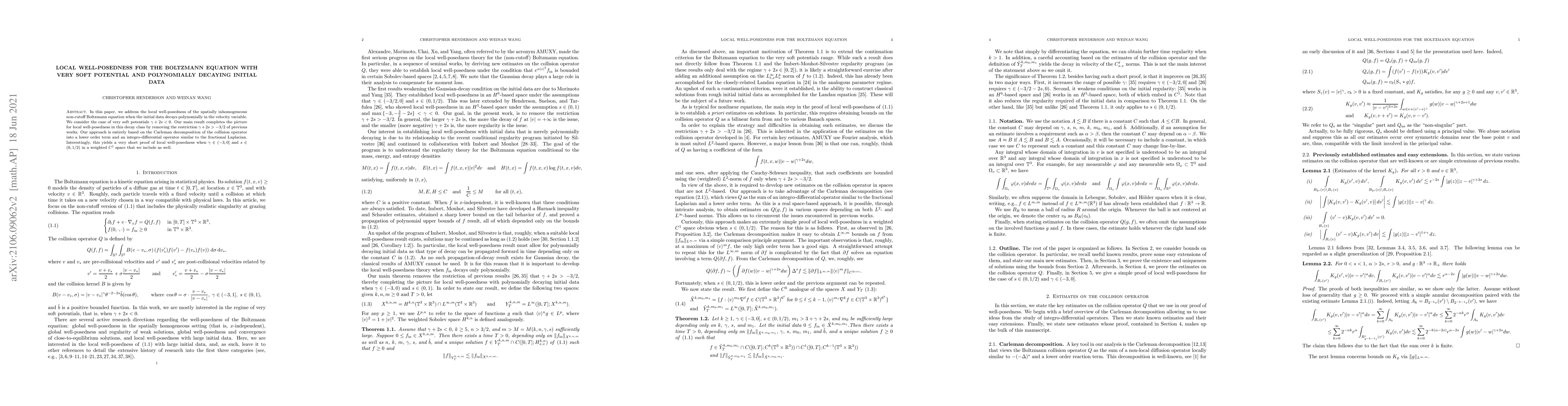 This paper establishes local well-posedness for the Boltzmann equation with very soft potentials and polynomially decaying initial data, removing previous restrictions. It utilizes a Carleman decomposition of the collision operator to achieve a concise proof of local well-posedness in a weighted $C^1$ space.